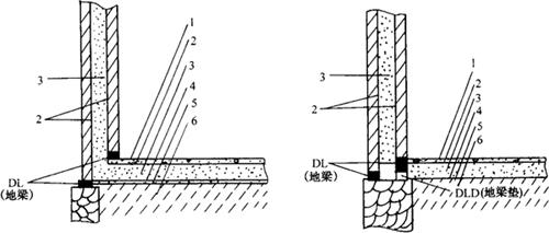 图3-26 内墙承重顶棚无冷桥结构示意图 1-防水层 2-承压层(稻壳作保温材料时有) 3-防潮隔汽层材料 4-保温材料 5-防潮隔汽层 6-承重层 (2)地面。地面保温设计时由于涉及承重墙问题,极易形成冷桥,因此结构设计难度大,保温材料密度要求高,其设计如图3-27所示。当内墙不承重时无冷桥设计如左图;右图所示为内墙承重时的处理方法,内墙地梁下保温层中每隔1000~1500mm,加一个300mm×240mm×100~300mm的地梁垫。