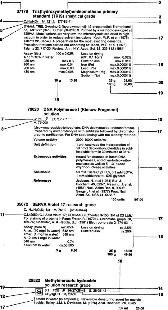 释义 | 德国Serva产品目录 德国Serva1988/1989产品目录也有一些独特的地方。该公司主要经营生物化学和分离技术用产品,这里把它有特色的内容作一些介绍。 (一)中文介绍 为了在我国市场上销售,公司在香港的代表机构印制了有中文的封面,把经营的产品的几个主要类别用中文,配以不同颜色印制出来,给人以醒目的感觉,它列出的类别有10种:①免疫学;②分子生物学;③离子交换树脂;④多肽;⑤电泳;⑥微生物学;⑦液相色谱;⑧酶;⑨组织培养液;⑩气相色谱。这10个类别对从事生物和医学科学的研究人员是很熟悉和具有适应性的。 (二)重视新产品 这本产品目录极为重视新产品介绍,其表现为:①用德文和英文两种文字介绍新产品;②包括800种以上最新产品;③提供了300种以上项目免疫学的新产品;④提供了更广泛的产品和安全资料;⑤在电泳、高压液相色谱,组织培养和分子生物学等方面,把他们发展了的领域也收入这本目录的主要章节。 (三)产品介绍 用例解的方式说明了目录正文中各部位所刊载的内容。一共有20项。 (四)纯度等级 对纯度等级,该公司作了如下划分: 1.分析级:分析试剂、标准物质。 2.研究级:研究和常规用高质量试剂或符合药典的商业制品。 3.纯:对某主成分有高含量的纯化商用产品。 4.实验用:合成用商用制品。 (五)危险和安全条款 对危险品的危害性以及安全预防措施有较详细的介绍,它按欧洲危险物质委员会成员和联邦德国的规章,在目录中用危险符号、数字和安全符号注明危险物质,还标明了危害符号和危害类型,因为这对经营、管理和使用化学物品的人都很重要。(详细条目见第九章。) (六)分支机构通讯 包括世界各地Serva代表的通讯联络地址,一般贸易条款也都作了介绍,如价格和付款办法、保证和退货、运输限制、商品保险办法、可靠性、储存、冷藏运输、注册商标和专利等。 (七)目录的编排方法 这本目录也是以英文字母顺序排列的,但对如下八大类产品作了集中的介绍,它们是:①电泳用试剂,②气相色谱,③免疫学,④离子交换,⑤液相色谱,⑥微生物学,⑦分子生物学,⑧组织培养。凡属这些类别的产品都收集在一起再分成若干小类进行编排,只要熟悉各类内容的人都容易查找。 目录最后也把公司作为药盒销售的产品集中作了较详细的介绍。每个药盒除编号、名称、等级、价格等项目外,也说明了它包含哪些试剂,每种试剂的量。 |