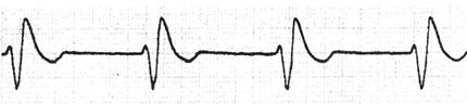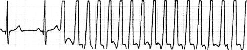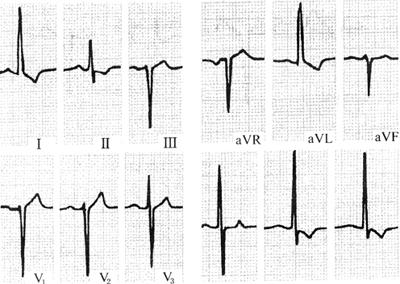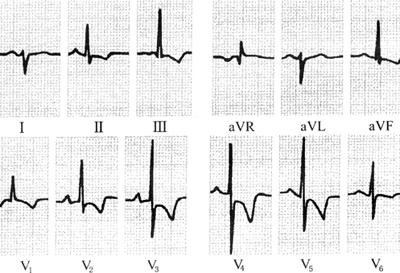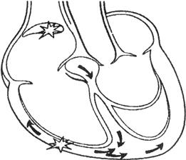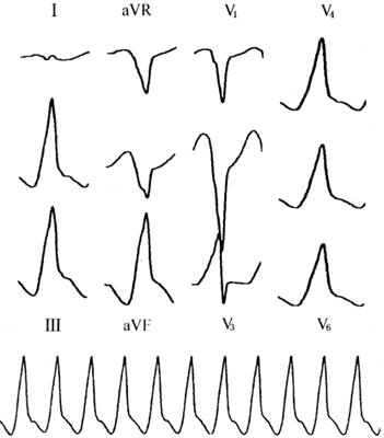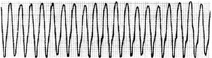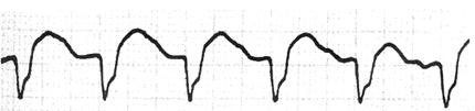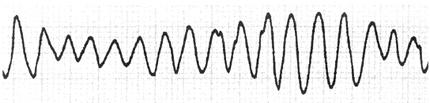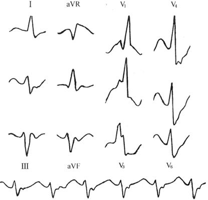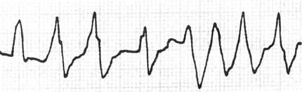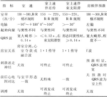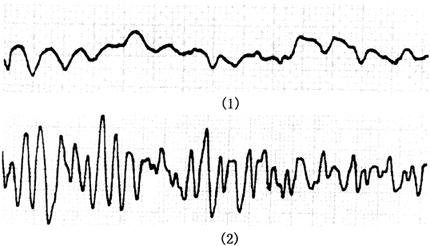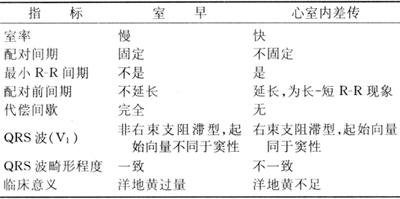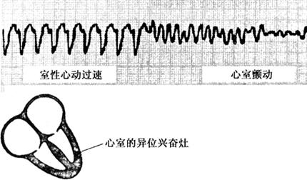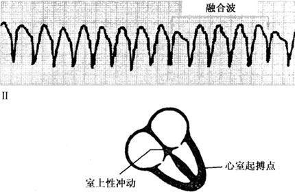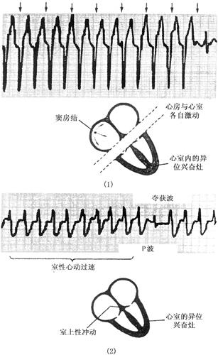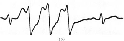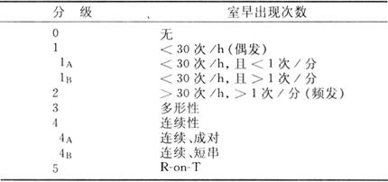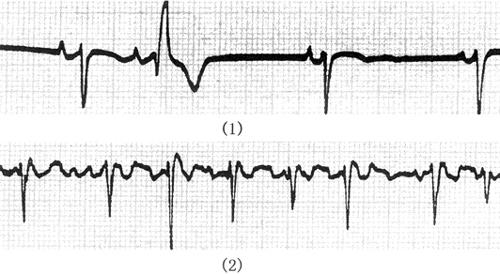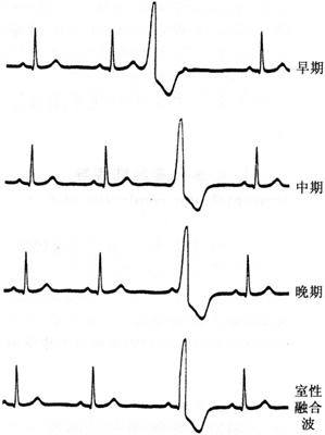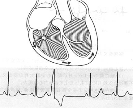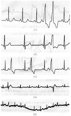 1.心室肥大(ventricular hypertrophy) (1)左心室肥大(LVH)的心电图表现为: ·Rv5或Rv6>2.5mV或Rv5+Sv1>4.0mV(男)或>3.5mV(女); ·RI>1.5mV,RavL>1.2mV,RavF>2.0mV或RⅠ+SⅢ>2.5mV; ·电轴左偏(<-30°); ·0.10s<QRS波时间<0.11s; ·ST-T改变。 左心室肥大和左心室肥大伴劳损,如图91、92所示。 图91 左心室肥大 图92 左心室肥大伴劳损* *:V4~6导联ST段压低,V2~6导联T波倒置 临床意义为: ·左心室肥大常见于高血压、主动脉瓣狭窄及关闭不全、肥厚型心肌病、PDA、VSD、ASD伴二尖瓣裂等。 ·诊断左心室肥大应结合心电图、体检和超声心动图等进行综合分析。 ·左胸导联R波增高也可见于左束支传导阻滞、预激综合征等,应加以鉴别。 左心室肥大记分法诊断标准如表5所示。 表5 左心室肥大记分法诊断标准 注:≥5分为左心室肥厚,4分为可疑左心室肥厚。 (2)右心室肥大(RVH)的心电图表现为: ·V1导联R/S≥1; ·Rv1+Sv5>1.05mV; ·电轴右偏(≥90°); ·aVR导联R/S≥1; ·V1导联可呈QS、qR型; ·ST-T改变。 右心室肥大和右心室肥大伴劳损如图93、94所示。 图93 右心室肥大 图94 右心室肥大伴劳损* *:V1~6导联ST段压低、T波倒置 临床意义为: ·右心室肥大见于肺心病、风湿性心脏病(二尖瓣狭窄)、先天性心脏病(肺动脉瓣狭窄、ASD、法洛四联症等)。 ·电轴右偏>+110°,对诊断右心室肥大有重要意义。不能过分依赖QRS波电压变化来诊断右心室肥大。 ·电轴右偏也可见于完全性右束支传导阻滞、预激综合征等,应注意鉴别。 2.室性早搏(prematuare veutricular contractions,PVCs) 室性早搏(室早)可发生于左心室或右心室。左心室起源的早搏V1导联为R波,V6导联为S波;右心室起源的早搏则V1导联为S波,V6导联为R波。 (1)心电图特征为: ·提前出现的QRS-T波群,其前无P波; ·QRS波宽大畸形,时间>0.12s; ·代偿间歇常完全。 间位性室早是位于2个正常窦性搏动之间的室早。 多源性室早是指室早的起源点有2个以上。室性并行心律的室早与前一心搏间距不等,室早间距相等或有公约数,常可见室性融合波。 室性早搏的形成机制如图95所示。 图95 室性早搏的形成机制 室性早搏的类型如图96所示。 图96 室性早搏的类型 (1)室早连发;(2)间位性室早;(3)室早二联律;(4)多源性室早;(5)室性并行心律;(6)R-on-T 室性融合的波形成机制如图97所示。 图97 室性融合波的形成机制 不同时期的室性早搏如图98所示。 图98 不同时期的室早 (2)诱因与处理:引起室早的原因可分为功能性和器质性2类。 1)功能性室早病人的心脏正常,常由迷走张力增高、焦虑、紧张、饮酒、吸烟、喝咖啡、使用拟交感类药物(肾上腺素、异丙肾上腺素等)、低血钾、洋地黄中毒、低氧血症引起,此类病人不必针对室早进行治疗,去除诱因后,早搏可减少或消失。 2)器质性室早可见于各种心脏病,包括心肌梗死、心肌病等,此类病人的治疗,也是针对基础心脏病的,只有当室早影响了血流动力学或使基础心脏病加重时,才有必要适当使用药物治疗(Ⅰb、Ⅰc、Ⅱ、Ⅲ类抗心律失常药)。 室性早搏Lown分级标准如表6所示。 表6 室早Lown分级标准 临床医生应牢记:无症状室早,不必治疗,也不必向病人过多解释,以免增加病人心理负担;即使有症状,且室早频发,临床医生应客观地向病人及家属说明病情,适当进行治疗;药物无效的频发室早,条件允许时,可试行射频消融术,成功率为80%;心梗溶栓再灌注过程中出现的室早,应高度警惕,可预防性使用利多卡因以防致命性心律失常的发生。 3.心室内差异性传导(intraventricular conduction defect) 由于心室内生理性传导变化,致心室除极顺序改变,QRS波有异于正常的现象,称为心室内差异性传导(心室内差传)。心室内差传常与心率快有关。激动发生越早,心室内差传的可能性就越大,差异的程度也越严重;长间歇后的心搏容易发生心室内差传。心室内差传以右束支阻滞型最多见(图99)。 图99 心室内差异性传导 (1)房早伴心室内差传;(2)房颤伴心室内差传 房颤时室性早搏与心室内差传的鉴别如表7所示。 表7 房颤时室早与心室内差传的鉴别 4.室性心动过速(ventricular tachycardia,VT) 室性心动过速(室速)是指连续5个以上室早形成的异位心律。 (1)分类: ·持续时间<30s的阵发性室速称为非持续性室性心动过速(non-sustained ventricular tachycardia)(图100); 图100 阵发性室速 ·持续时间>30s的室速称为持续性室速(sustained tachycardia)(图101); 图101 持续性室速 ·QRS波形态一致者称为单形性室速; ·QRS波形态不一致者称为多形性室速(图102)。 图102 多形性室速 ·QRS波尖端在等电位线上下扭转,可伴Q-T间期延长,称为尖端扭转型室速(torsade depointes,TDP)(图103)。 图103 尖端扭转型室速 (2)心电图特征为: ·QRS波与窦性心律时不同,呈宽大畸形,时间>0.12s; ·房室分离(室房1∶1逆传者除外),P波节律慢于QRS波节律; ·可见心室夺获和(或)室性融合波。 室速的电生理可能与折返激动、自律性增高、后除极及触发活动有关。 室速向室颤转变如图104所示。 图104 室速向室颤转变 宽QRS型心动过速除室速外,还应考虑: ·心动过速伴心室内差异性传导; ·心动过速伴束支传导阻滞; ·预激综合征心动过速发作; ·房颤、房扑伴心室内差异性传导。 宽QRS波心动过速的鉴别要点如表8所示。 表8 宽QRS波心动过速的鉴别要点 (3)Brugada室速分析步骤: ·胸前导联无一个导联QRS波呈RS型,则为室速; ·若有导联呈RS型,测R波起点至S波谷底间距离>100ms者,判断为室速; ·有房室分