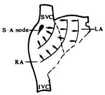 释义 | 心房除极 左右心房的除极过程并非同步进行,二者之间相差0.01s。 由于窦房结位于右心房后上部,因而窦房结发出的激动先使右心房除极,其方向指向前下稍偏左;随后两心房同时除极,其方向指向左下稍偏前;左心房最后除极,其方向指向左后稍偏下。心房除极过程中各瞬间向量尖端的轨迹称之为*P环。心房除极过程在心电图上则表现为*P波。 心房除极 |