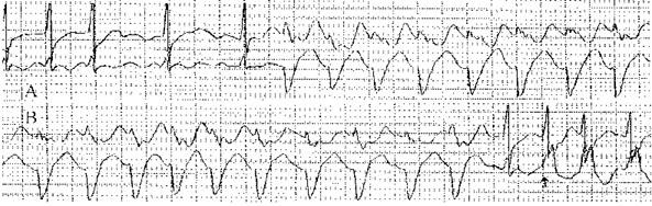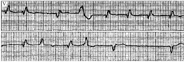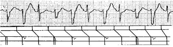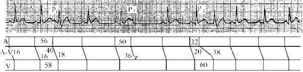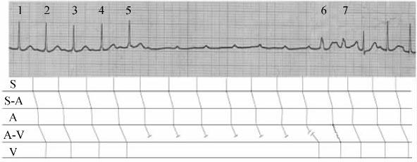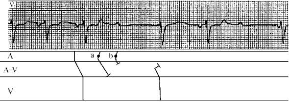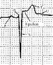 释义 | 心电现象的特殊类型 【J 波】 J波(J Wave)系指位于QRS波与ST段最早部位之间的一个十分缓慢的波,又称驼峰征(camel-hump sign)、晚发δ波(late delta wave)、J点波电流损伤波、低温波、Osborn波等。 图2-20-1 J点示意图 (一) 心电特征 J波常起始于QRS波的R波降支部分,呈圆顶状,与其前面的R波形成了尖峰一圆顶状波,尤以胸导联检出为多,J波呈频率依赖性,心率减慢时明显,心率增快可消失,早期复极综合征所见之J波,于运动后变低或消失。此外,J波并受多种因素影响,包括随人体温度降低及体液酸化后加着等(图2201)。 (二) 发生机制 临床观察表明,J波为心室提前发生的复极波。通常,心室除极与复极过程可有一重叠区,持续时间为10ms,形成J点。然而,遇某种因素致心室除极与复极过程迟缓,当两者程度有参差,除极较复极明显时,可在继较多的心肌尚未除极完成时就复极而导致除极与复极重叠区的增宽,形成J波。 (三) 临床意义 临床发现,多数产生J波的患者可伴窦性心动过缓、血压偏低等迷走神经张力增高的表现。认为与心肌内交感神经网络缺陷有关。此外,临床有多种疾病可引发J波,现已见有并发恶性室性心律失常的报道,故有其重要的临床价值。有认为J波伴发的恶性室性心律失常β受体阻滞剂治疗奏效不着,但当给予钙拮抗剂却具防治价值。 图2-20-2 Epsilon波示意图 【Epsilon波】 (一) 心电特征 常规心电图于V1和V2导联的QRS波末(ST段初)描记得的一种低幅棘波或震荡波(small wiggle)。Epsilon波可使QRS波的时限增宽至100ms(图2202)。 (二) 发生机制 由Fontaine发现并命名,正常情况下,左右心室的心肌细胞除极迅速而几乎同步。当存在某些病理状态时,右室的部分心肌细胞萎缩退化,由纤维或脂肪组织替代,形成为脂肪组织包绕(脂肪瘤样改变)的岛样存活心肌细胞,若处于病态的部分右室心肌细胞除极延迟(该部除极可在左室及右室大部分除极后出现),即可由V1、V2导联于QRS波后,ST段的初始部分描记得Epsilon波,故又称后激电位(Post excitation potential)或右室晚电位(right ventricular later potential)。 (三) 临床意义 为诊断心律失常性右室发育不良患者颇具特征性的心电标志,尤其在反复室速、室颤发生时更具重要的临床意义。此外,在后壁、右室心肌梗死以及其他右室受累的疾病中,也可记录得Epsilon波。 【直接显示性束支内文氏现象】 (一) 心电特征 心电描记示QRS波群时间呈逐渐增宽的现象。以3∶2阻滞为例,文氏周期第一个心搏的QRS波群形态、时间正常;第二个心搏表现为不完全性束支阻滞;第三个心搏为受损侧束支文氏周期的结尾心搏,呈完全性束支阻滞(图2-20-3)。 图2-20-3 左束支直接显示性文氏现象(3∶2传导)及不完全隐匿性文氏现象 (二) 发生机制 存在病理损害的束支传导功能可有部分的减退,当激动传经受损一侧束支时,传导逐搏延缓,直至完全受阻,之后又恢复新的周期。电生理研究证实,束支阻滞的程度取决于左右两侧束支激动到达心室的时间差,大于0.04~0.06s者,QRS波群正常或呈不完全性束支阻滞图形;两者差值达0.04~0.06s以上,则出现完全性束支阻滞图形。 (三) 临床意义 少数见于正常人,预后较佳。仅发生于右束支者,多见于风湿性心脏病、冠心病、先天性心脏病。若累及左束支,多为冠心病、风心病、心肌病等,预后较差。 【隐匿性传导】 (一) 心电特征 隐匿性传导可发生于多种心律失常中,常不能由心电所直接显示,内仅部分可凭藉其改变接踵而至的冲动形成或传导者为临床所识别:规则的自律性被扰乱;轻度阻滞骤变为严重阻滞;与不应期规律不符的室内差异传导;持续的差异传导;超常传导现象以及不典型文氏现象等(图2-20-4)。 图2-20-4 隐匿性交界区早搏使其后的窦性激动下传受阻 (二) 发生机制 隐匿性传导系心脏特殊传导组织中的阻滞所致,可由干扰、折返、重整、超常传导、韦金斯基现象等显示。虽然,阻滞前激动的传导并未能使心房或心室除极,但因特殊传导系统已经除极,并产生新的不应期;或冲动在进入特殊传导系统的起搏点后,使该起搏点产生节律重整进而改变其原有的周期(图2-20-5)。 图2-20-5 房性早搏产生隐匿性传导 (三) 临床意义 干扰现象中的隐匿性传导可见于正常人。器质性心脏病患者发生隐匿性传导可能存在传导系统器质性损害,也可能系功能性变化。此外,药源性者尤多见于洋地黄中毒时的隐匿性传导。另该现象尚可由电解质紊乱引起。 隐匿性传导在临床可具生理性代偿作用,如房颤时,减慢心室率以维护心功能。但当呈现病理性变化时,可延迟逸搏的出现,致心室率骤降,引起晕厥,甚至阿斯综合征。 【蝉联现象】 (一) 心电特征 1972年Rosenbaum首次将束支间连续的跨室间隔发生的隐匿性传导,并引起一侧束支持续的功能性阻滞的心电现象命名为蝉联现象(Linking phenomenon)。 1.构筑蝉联现象的基础条件 (1) 激动传导方向出现传导速度与不应期不均衡的两条径路。 (2) 基础心率在原有基础上常有突然增快的现象或发生早搏。 (3) 基础心率增快或早搏发生时,一条径路的有效不应期长,提前的室上性激动下传时遇其有效不应期而发生功能性阻滞。或两条径路的不应期与传导速度相差40~60ms以上,激动通过两条径路传导的时间相差40~60ms以上,心电图可出现一侧径路功能性阻滞的表现。 (4) 室上性激动沿不应期短的径路下传时,同时还存在向对侧径路发生的隐匿性传导。 2.
