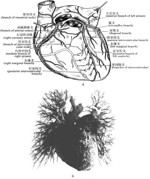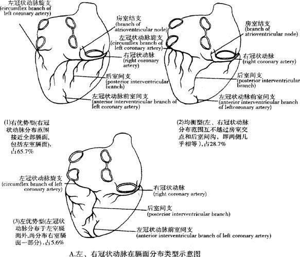 释义 | 心脏的血管 (一)动脉 营养心壁的动脉有左、右冠状动脉,都是主动脉起始部的分支(图6-2A~D,图6-8A、B)。 图6-8 心脏的动脉(A、B) 1.左冠状动脉(left coronary artery) 起于主动脉左窦,经左心耳与肺动脉起始部之间向左前方行进,随即分为旋支(circumflex bramch)和前室间支(anterior interventricular branch),旋支在冠状沟内向左行走,然后从前向后绕到左心室隔面。前室间支(前降支)在前室间沟内下行,绕过心下缘在后室间沟内上行1.0~3.0m,与右冠状动脉的后降支吻合。左冠状动脉沿途发出的分支主要分布于左心房壁、左心室壁、室间隔前部和右心室前壁的一部分。 2.右冠状动脉(right coronary artery) 起于主动脉右窦,经右心耳与肺动脉起始处之间入冠状沟,由此向右后方,转入后室间沟,途中发出分支,其中较大而恒定的分支有后室间支(posterior interventricular branch),较粗,是主干的延续,沿后室间沟走行;左室后支(posterior branch of left ventricle)在房室交点处分出,沿冠状沟向左行走,距离不等(最远者可达心左缘)。右冠状动脉主要分布于右心房壁、右心室壁,室间隔后部及左心室后壁一部分。 左、右冠状动脉主要的分支有:①窦房结动脉(artery of sinuatrial node)(图6-8A):约束60%起于右冠状动脉起始段,在主动脉和右心耳之间沿右心房壁向后上行至上腔静脉根部;40%起于左冠状动脉旋支开始段,在主动脉后方横过左、右心房前壁至上腔静脉根部。②房室结动脉(artery of atrioventricular node)(图6-9A、B):90%起于右冠状动脉“U”形弯曲处,向深部沿房间隔走到房室结。当急性心肌梗死伴有房室传导阻滞时,应先考虑右冠状动脉闭塞。③动脉圆锥支(branch of arterial conus):左、右各一。分别由左冠状动脉前室间支和右冠状动脉发出,在动脉圆锥前上部相互吻合形成Vieusen环。该环是左、右冠状动脉之间的重要侧支循环通路之一。④左缘支和右缘支(left and right marginal branch):左缘支起于左冠状动脉旋支,沿心左缘走行;右缘支起自右冠状动脉,沿心下缘向心尖走行,与前后室间支吻合。左、右缘支比较恒定和粗大,是冠状动脉造影时识别血管分支的标志之一。 图6-9 左、右冠状动脉(A) 图6-9 左、右冠状动脉(B) 由于左、右冠状动脉分支在膈面的分布范围变异较大,现按Schlesinger分类法分为三型,即右优势型、左优势型和均衡(势)型。据中国人1150例资料,右优势型多见,占65.7%。详见图(图6-9A)。 据临床观察:心肌梗死左冠状动脉比右冠状动脉较为常见。故心肌梗死多发生于左心室的一定范围,其中左心室前壁、心尖部及室间前2/3,约占全部心肌梗死的50%,这些区域正是左冠状动脉前降支血供的解剖部位(图6-9A、B)。不难理解心肌梗死的解剖位置与闭塞的冠状动脉血供范围相一致。基于冠状动脉分布变异较大,故熟悉冠状动脉分布的相关变异,有临床参考意义。 (二)静脉 心脏的静脉主要属支与动脉伴行,最后主要汇合入冠状窦。冠状窦(coronary sinus)位于心脏后面冠状沟内,由左向右经冠状窦口汇入右心房(图6-2B、D)。心脏绝大部分的静脉血经此途径流入右心房,其主要属支有心大静脉(great cardiac vein),在前室间沟内与动脉前室间支伴行,向上至冠状沟左侧绕行至左室膈面注入冠状窦左端。心中静脉(middle cardiac vein)与后室间支伴行,注入冠状窦右端。心小静脉(small cardiac vein)在冠状沟内与冠状动脉伴行,向左注入冠状窦右端。除以上主要回流途径外还有小量静脉血可经心最小静脉和心前静脉回到心脏。心最小静脉(smallest cardiac veins)又称Thebesian静脉,是位于心壁内的小静脉,直接开口于各心腔壁(较多进入右心房)。心前静脉(anterior cardiac veins)有2~3条起于右心室前壁,越过冠状沟开口于右心房。 心脏的动脉、心壁内的毛细血管、心的静脉共同组成心脏营养血管,这些血管内流动的血液循环称为冠状循环(coronary circulation)。由于此循环途径引起的心脏病称为冠心病(coronary heart disease)。冠心病绝大多数由冠状动脉粥样硬化(coronary atherosclerosis)所引起。好发部位据中国6352例尸检统计,病变的总检出率、狭窄的检出率和平均值,均以左冠状动脉的前降支最高,其余依次为:右主干、左主干或左旋支、后降支等。性别差异:20~50岁检出率男性高于女性;60岁后性别差不明显。 据观察冠状循环的血管吻合比较广泛,主要有下列三种。①冠状吻合:同一冠状动脉的分支间(同一冠状吻合)以及左、右动脉分支间(冠状间吻合)均有吻合。吻合见于整个心壁,一般认为人冠状吻合的吻合管直径为50~350μm,虽然它们在冠状动脉急性闭塞时,其侧支血流灌注不能阻止心肌梗塞的发生,但在慢性闭塞时却具有重要功能意义。冠状吻合的吻合管在出生时已经存在,其口径和长度随年龄的增长而增长,至20岁左右达定型状态。青年人冠状动脉闭塞时极易发生心肌梗塞(myocardiac infraction),可能与其吻合管尚未发育完善有关。②壁腔吻合:是心壁内特殊血管与心腔之间的交通,包括心最小静脉、心肌窦状隙等。③与心外血管吻合:冠状动脉分支与来自心周围的动脉支,如胸廓内动脉、支气管动脉等,在主动脉根部、肺动脉干、心包和心房等处形成小动脉网。 冠状循环血管吻合的存在并不能说就具有侧支循环的功能。关键问题是有许多因素影响吻合形成有效侧支循环的建立,如冠状动脉闭塞的位置是在动脉的最远端或最近端、闭塞发展的速度,以及邻近的动脉有没有闭塞等因素