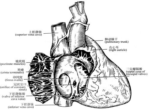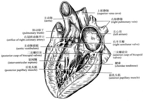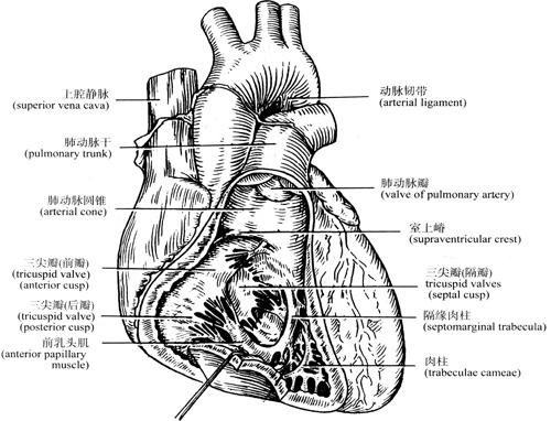 释义 | 心腔的形态结构 (一)右心房 右心房(right atrium)位于心的上部(图6-2A、图6-3)。向前上部突出的部分称为右心耳(right auricle of heart),内有许多平行排列隆起的心房肌,称为梳状肌束,当心功能发生障碍血流瘀滞时,易在心耳内形成血凝块脱落形成栓子(embolus)。右心房有三个入口和一个出口:右心的后上壁有上腔静脉口(orifice of superior vena cava);下壁有下腔静脉口(orifice of inferior venacava),下腔静脉口前缘有半月状的下腔静脉瓣(Eustachian valve),胎儿时该瓣膜具有引导血液经卵圆孔流向左心房的作用;在下腔静脉口与右房室口之间有冠状窦口(orifice of coronarysinus)。它们分别引导人体上、下半身和心壁的静脉血流入右心房。出口为右房室口(right atrioventrioular orifice),通向右心室。房间隔较薄,其下部有一浅窝,称卵圆窝(fossa ovalis),是胎儿卵圆孔闭锁后的遗迹。 图6-3 右心房 (二)右心室 右心室(right ventricle)位于右心房的左前下方,构成胸肋面的大部分,室壁厚约3.0~4.0mm(图6-2A、图6-4)。室腔略呈尖端向下的锥体形,室腔底有右房室口和肺动脉口所占据,两口之间的室壁上有一弓形的肌隆起,称室上嵴(supraventricular crest)将室腔分为流入道和流出道两部分。流入道位于室腔右下较大的区域。入口是右房室口,口呈卵圆形,周径平均11cm,可容纳三个指尖。口周围有纤维环,环上附着三个三角形瓣膜,称三尖瓣(右房室瓣)(tricaspid valve),分前尖(anterior cusp)、后尖(posterior cusp)和隔侧尖(septal cusp)。室壁内有纵横交错的肌隆起,称肉柱(trabeculae cameae)。在室腔前、后、内侧壁上可见三组锥状隆起,称乳头肌(papillary muscles)。每个乳头肌尖端发出的腱索(tendinous cords)与相邻的两个尖瓣相连。纤维环、瓣膜、腱索和乳头肌在功能上是一个整体,当心室收缩时由于纤维环缩小和血液推动,使三尖瓣互相对合,封闭右房室口,乳头肌收缩和腱索牵拉,瓣膜不致翻向心房,能有效地防止血液逆流至右心房。流入道位于室腔左上角,室上嵴至肺动脉口之间的光滑区域,形似倒置的漏斗形,称动脉圆锥(conus arteriosus),其上端借肺动脉口(orifice of pulmonary trunk)通动脉干。口周围的纤维环上附有三个袋口朝上的半月形瓣膜,称肺动脉瓣(pulmonary valve),每个瓣膜游离缘中央有一个半月瓣小结(nodules of semilunar valves)。当右心室舒张时,半月瓣受肺动脉干内血液压力而闭合,防止血液逆流入右心室。 图6-4 右心室 (三)左心房 左心房(left atrium)构成心底大部分(图6-2B、图6-5),是四个腔中最后面的部分。其前部向右前方突出的部分,称左心耳(left auricle),掩盖肺动脉根部的左侧。左心耳壁内面也有发达的梳状肌。位于左心房后壁的两侧各有两个肺静脉口(orifices of pulmonary veins)。左心房的出口为左房室口(left atrioventricular orifice),在左心房的前下部,是左心房通左心室的出口。 图6-5 左心房及左心室 (四)左心室 左心室(left ventricle)位于左心房的左前下方(图6-2B、图6-5),其内部结构与右心室相似,但室壁厚约9.0~12.0mm,约为右心室壁的2~3倍,肉柱较细,乳头肌及腱索较粗大。乳头肌有前后两个(或两组)位于左心室的前、后壁上。左心室以前尖瓣为界分为流入道和流出道。左心室的入口为左房室口,略小于右房室口,口周缘附有两个三角形帆状瓣膜,称为二尖瓣(bicuspid valves)或僧帽瓣(mitral valve),前尖瓣较大,后尖瓣较小。它与腱索及乳头肌的关系及作用与右房室口的三尖瓣相同,可防止左心室血液逆流入左心房。其出口为主动脉口(aortic orifice),口的周围的纤维环上,亦有三个袋口朝上的半月形瓣膜,称主动脉瓣(aortic valve),形状与肺动脉瓣相似,但稍大而坚韧,半月瓣小结明显,其作用肺动脉瓣相似,可防止主动脉的血液倒流入左心室。与主动脉瓣相对的主动脉壁向外膨出,瓣膜与主动脉壁之间的内腔称为主动脉窦(aortic sinus),可区分为左、右、后三个窦,其中主动脉左、右窦分别有左、右冠状动脉开口。 |