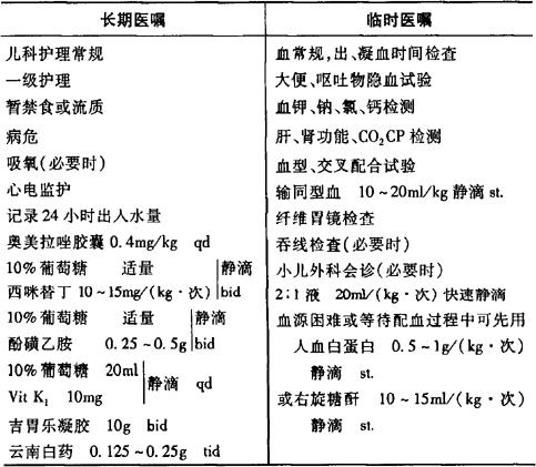 释义 | 急性上消化道出血 说明:1.针对病因治疗。 2.胃出血可用冷盐水洗胃,或凝血酶2000U加生理盐水100ml口服或通过胃管注入。 3.急性失血患儿引起血容量减少,应先输液以恢复血容量,液体可用2∶1液(2份生理盐水,1份1.4%碳酸氢钠)或生理盐水,也可输入中分子右旋糖酐或5%人血白蛋白。 4.如内科治疗无效,须考虑内镜下止血,必要时手术止血。手术止血的指征为:①出血量达血容量25%以上者;②出血不很迅速,但1~2天内仍出血不止,呕血严重者;③急性胃肠穿孔者。 |