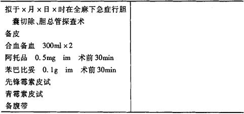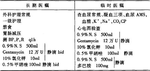 术前医嘱 说明:(1)术前应尽可能补充液体,纠正酸碱紊乱。 (2)术后逐步完成其他检查。 手术医嘱 注意:心动过速者应改阿托品为海俄辛,剂量为0.3mg 术后医嘱 说明:(1)探查胆管者注意引流情况。 (2)术后注意驱虫。 (3)升压药应维持较长时间,注意纠正水电解质酸碱紊乱,加强营养补充。 |