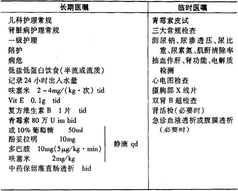 2.少尿期需严格记录出入量,量出为入。每日液量=前一天尿量+不显性失水量(400ml/m2)+前一天异常丢失量(如呕吐、引流液等)-内生水(100ml/m2)。体温若高于37℃,每增加1℃,不显性失水增加75ml/m2,计算入每日入量中。