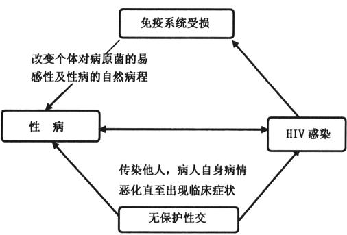全球流行病学、生物学和人群干预性研究证明,性病是HIV传播的协同因素,也就是说感染性病后会增加感染HIV的危险性,其程度从1.5倍到8.5倍不等。就是说,与未患性病的人相比,一个性病病人与一个HIV感染者发生性接触,其感染HIV的危险性,是未患性病者的1.5~8.5倍。无论是生殖器溃疡性疾病,还是非溃疡性疾病均可增加感染HIV的危险性,如对全球报告的34项研究结果进行分析,感染梅毒可增加感染HIV的危险性达2~9.9倍,软下疳增加2.4~18.2倍,生殖器疱疹增加2.3~8.5倍,沙眼衣原体感染增加3.2~5.7倍,淋病增加1.5~8.9倍,阴道滴虫病增加2.7倍,尖锐湿疣增加3.1~4.1倍。另有研究证实,支原体感染、阴道念珠菌病、细菌性阴道病等感染同样可增加HIV感染的危险性。性病与HIV感染的关系见图1-3。