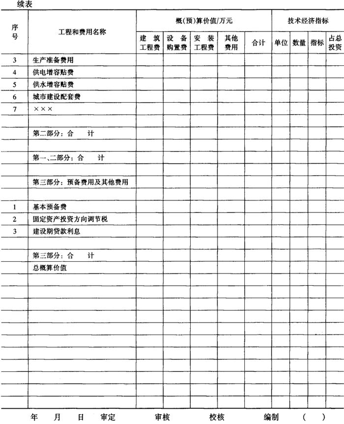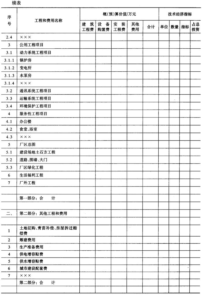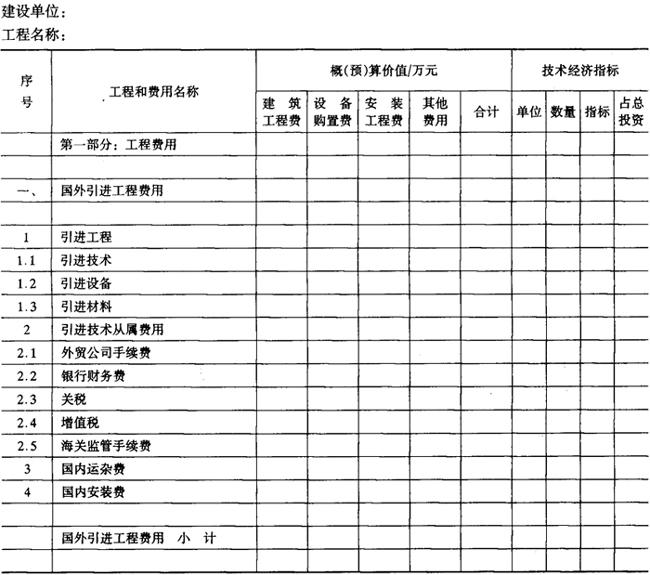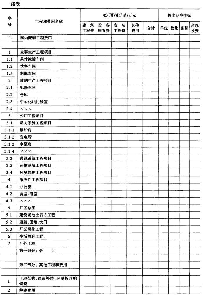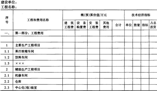 释义 | 总(综合)概算表 总概算表见表6-10-3,其内容由单项工程综合概算和其他工程和费用汇总编制的,综合概算是确定单项工程造价的文件,由单位工程概算综合而成的,一般饮料工程项目可以不编制综合概算,直接在单位工程概算的基础上汇编总概算,总概算表的内容主要由两部分费用组成,第一部分工程费用是直接构成固定资产的项目,第二部分其他工程和费用是一切未包括在第一部分工程内,并与项目建设有关的费用。根据国家有关部门规定可由工程建设投资支付的其他工程和费用,除以上两部分费用外,还要计列预备费和有关规定的其他费用。引进工程见表6-10-4,其编制规定参照中国轻工总会颁发的《轻工业工程设计概算编制办法》(QBJS10)第六章节。 表6-10-3 总(综合)概算书 表6-10-4 总(综合)概算书(引进工程) 1.第一部分工程费用项目 (1)主要生产工程项目 包括原料处理车间、调配车间、制瓶车间、灌装车间、装箱车间等全部工程和设备。 (2)辅助生产工程项目 包括机修、化验、冷库、各类仓库等工程及设备。 (3)公用工程项目 包括动力系统工程项目(锅炉房、变电所、水泵房)、通讯系统工程项目、运输系统工程项目、环境保护工程项目(污水处理)等。 (4)服务性工程项目 包括办公楼、食堂、浴堂等工程。 (5)厂区总图 包括建设场地土石方工程、道路、围墙、大门、厂区管线、厂区绿化等工程。 (6)生活福利工程 包括宿舍、文化福利设施等工程。 (7)厂外工程 包括厂区外的给排水、供电线路、道路等工程。 2.第二部分其他工程和费用 其他工程和费用的取费标准,按建厂所在地的省、市、自治区的具体规定计算,主要内容有: (1)土地费用 一般包括土地征用费和迁移补偿费等。 (2)筹建费用 包括前期工作费用和建设单位管理费等。 (3)生产准备费用 包括生产人员培训费、办公及生活用具购置费、联合试运转费等。 (4)其他工程和费用 城市建设配套费、各项增容贴费、勘察设计费等。 3.预备费及其他有关规定的费用 包括不可预见的工程和费用、固定资产投资方向调节税、建设期贷款利息及其他等。 |