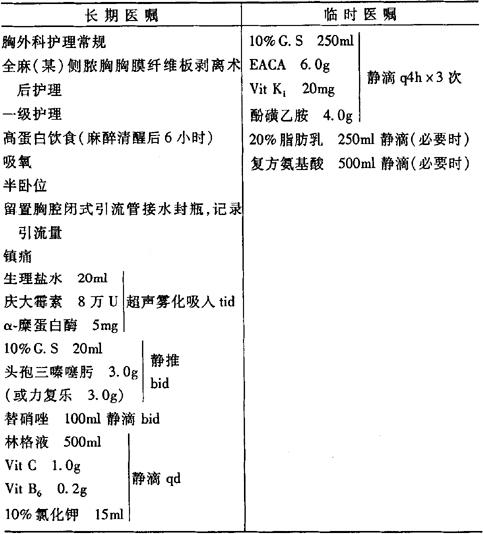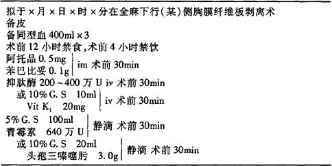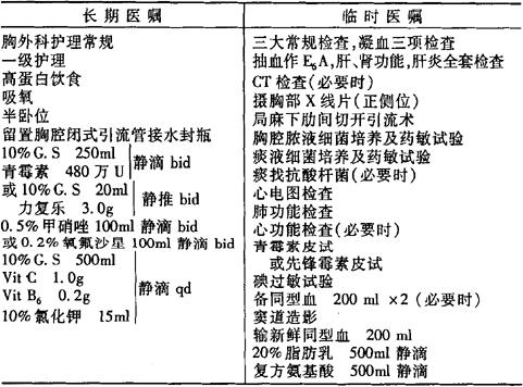 术前医嘱 手术医嘱 术后医嘱 说明:(1)慢性脓胸主要是在积极引流,积极补充营养、水电解质并抗感染的前提下,争取尽早开胸手术行纤维板切除术等。 (2)术后主要是保持引流通畅,继续积极补充营养。 |