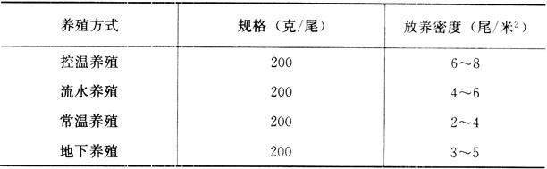 2.放养密度 娃娃鱼成体放养密度要根据各地的养殖方式、技术水平、养殖条件而定。现将成体不同养殖方式的放养标准归纳于表5-2。