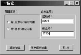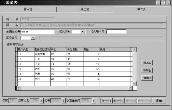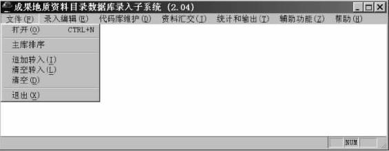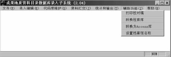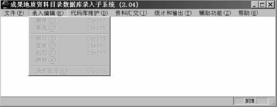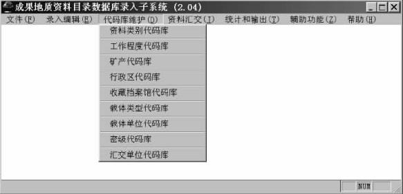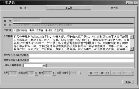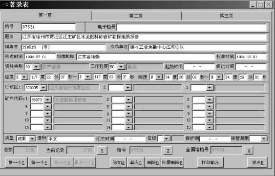 第一部分 系统要求及软件安装 一、操作系统要求 查询子系统若安装在单机上,则要求操作系统必须是WIN98或安装有个人WEB服务器的操作系统:若安装在网络服务器端,则要求操作系统为NT4或Win2k。 录入子系统则不受以上限制,在Win95以上版本即可。 二、软件安装 1.安装录入子系统 执行安装光盘CGML。目录下MULU子目录中的“setup.exe”,根据安装向导键入或选择用户自己的安装路径进行安装(例如“mulu”),也可使用系统的默认路径。 注意:为保证数据安全,用户自己录入的目录数据要单独放在用户指定的专用路径中,不要与该录入软件放在同一目录下。 2.安装查询子系统 执行安装光盘CGML。目录下SEARCH子目录中的“setup.exe”,根据安装向导键入或选择用户自己的安装路径进行安装(例如“search”),也可使用系统的默认路径。 注意:通常情况下,在单机上同时安装录入和查询两个子系统时,两个子系统所选择的安装路径及目录名应相同,如“C:\CGML”,避免查询数据的拷贝。 第二部分 《录入子系统》操作指南 一、主菜单功能介绍 图1 主菜单中各项功能如下: 1.文件 主要完成数据库文件的数据转入、打开与主库的排序(图1)。 (1)打开:打开系统库(包括主库、子库)并弹出“着录表”窗口,用户在此窗口进行数据录入与编辑。其中主库数据包括录入软件着录表第一页和第二页的所有数据,子库数据只包括着录表第三页的资料保管数据。 (2)主库排序:可将主库的数据按照档号由小到大进行排序。 (3)追加转入:将另一个与系统库结构完全一致的数据库中的所有数据(包含主库与子库)追加至系统库中,然后打开系统库,弹出“着录表”窗口。在追加转入时,系统将逐条检查转入数据库(主库)中的数据是否与系统库主库中的数据重复,如果重复则该条数据不被追加转入。 提示:当用户在多台微机上编辑完成多个数据库,并想将这些库合并在一起时可以使用此功能。 (4)清空转入:先将系统库中的数据全部删除(即清空系统库),然后将另外一个与系统库结构完全一致的数据库中的数据追加至系统库中,最后打开系统库并弹出“着录表”窗口。注意:转入数据的库结构必须与系统库的结构相一致。在转入前一定要确保系统内原有数据已经有效备份,即转入前要做好当前数据的备份(转出)。 (5)清空:将系统中主库与子库中数据全部删除。 2.录入编辑 可使用该菜单下的各项功能对“着录表”窗口中的数据进行剪切、复制与粘贴等操作(图2),具体使用方法同Word等字处理软件。 图2 该栏目下的所有功能只有在“着录表”窗口被激活的状态下才有效。使用主菜单中的“文件”菜单下的“打开”、“追加转入”和“清空转入”均可以激活“着录表”窗口。 3.代码库维护 对系统的九个代码库进行数据修改与维护(图3)。各代码库中详细数据参见《着录要求》。 图3 4.资料汇交 “资料汇交”模块的作用是将需要向上一级单位汇交,并且已经完成录入的资料数据转出到某个电子文件中,汇交时将该电子文件与相应的地质资料一并汇交(图4)。 图4 “资料汇交”模块包含“新资料汇交”和“打印汇交联单”两部分内容。具体功能如下: 新资料汇交:将需要向上级汇交并且已经完成录入的资料数据拷贝到某个电子文件中,汇交时将这些地质资料同该电子文件一同汇交。该项功能的使用方法参见“录入子系统”中的“转出”。 打印汇交联单:按档号或记录号选择范围打印汇交联单。 以上功能只在“着录表”窗口激活的状态下有效。 5.统计和输出 统计和输出部分中统计功能包括汇交统计、保管数量统计、工作程度-地区统计、地区-类别统计,输出功能包括卡片输出、账本输出、目录输出(图5)。 详细操作步骤见本部分第三项统计和输出功能。 图5 6.辅助功能 完成数据校对稿的打印、检索库的生成和默认资料档案馆名称的设置(图6)。 图6 (1)打印校对稿:先选择需要打印的数据库文件,再选择打印范围。具体操作参见“数据维护”中的“打印输出”。 (2)转换检索库:由用户选择需要转换的数据库文件,系统先将检索库中原有数据删除,再将用户指定的库文件数据转换至检索库中,供查询系统检索使用。 (3)转换为Access库:用户进行完转换检索库操作后,可将转换完的数据存储为微软的Access(MDB)格式。便于用户进行进一步的处理,或利用它直接转换到微软的大型数据库SQL中。供大型数据库网络查询检索使用。 (4)设置档案馆名称:用户可在此设置系统默认的收藏资料档案馆名称。一旦设置完成,系统库中的收藏资料档案馆代码及名称项的所有数据将全部使用默认值,以后转入的数据中收藏档案馆代码及名称项数据也将自动改为默认值。 注意:在设置之前,要确保在“收藏档案馆代码库”中存在您要设置的数据,如果没有您需要的代码及名称,您可以在“收藏档案馆代码库维护”中添加。如果您设置的值为空,表示没有默认值,系统在转入数据时将不改变原有数据。 二、数据维护 1.“着录表”窗口的使用 在“文件”下拉菜单下用鼠标点击“打开”项,系统即弹出“着录表”窗口。 “着录表”窗口为本录入系统的核心,成果地质资料目录数据均在此录入编辑。 与《着录单》对应,“着录表”窗口中也分为三个页面。 每页的下方均有“第一个”、“前一个”、“后一个”、“最后一个”、“退出”五个命令按钮,
