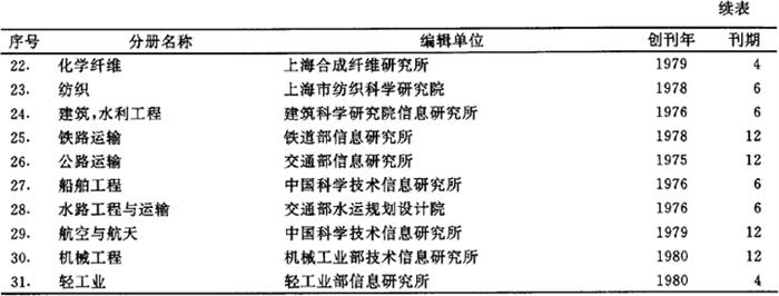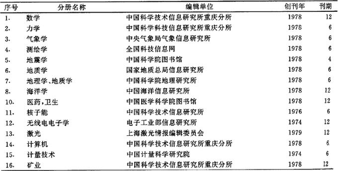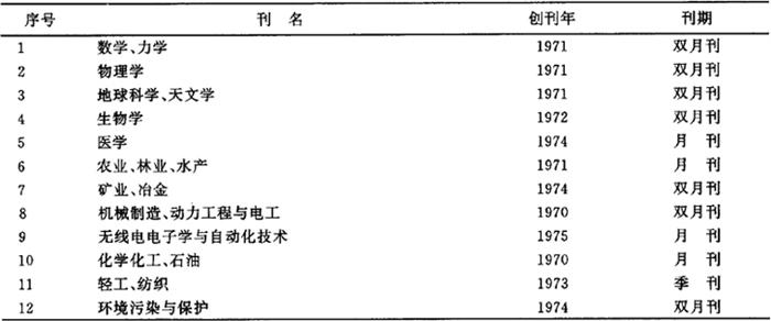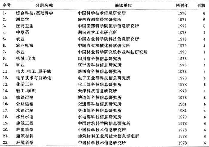 释义 | 我国检索期刊选介 目前,我国已基本建起了自己的检索工具体系,并逐步提高、完善。现就几种常用的检索工具作简单介绍。 1.《中文科技资料目录》 这是一套报道国内科技文献资料的题录性刊物,由中国科技信息研究所及其所属部分分所和有关图书信息单位按分册分工编辑出版。每年出版分册数量不等,后来有许多分册相继转为文献刊物出版。目前还在出版的有3个分册(“水利水电”、“建筑材料”和“船舶工程”)。其收录范围包括国内公开和内部出版的科技期刊论文、科技资料和译文。有些分册每年末期附有年度累积索引。现将各个分册的基本情况列表如下。 表2.4-1 《中文科技资料目录》各分册的基本情况表 2.《国外科技资料目录》 这是一套检索国外期刊论文、特殊文献和其它文献资料的题录性刊物,自1974年以来,共扩版至36个分册,目前其中多类分册已改为文献刊物。现有七个分册出版:“测会学”、“气象学”、“核科学技术”、“建筑材料”、“水利水电”、“电力”及“航空与航天”。现将过去出版的部分分册的基本情况列表如下。 表2.4-2 《国外科技资料目录》分册情况一览表(部分) 3.《国外科技资料馆藏目录》 这是一套由中国科技信息研究所编辑,专门报道该所馆藏的国外特种文献的题录性检索刊物,目前只是不定期出版。现将过去出版的12个分册的情况分列如下。 表2.4-3 《国外科技资料馆藏目录》分册概况一览表 4.主要报道国外科技文献的文摘刊物选介 (1)《机械制造文摘》 由中国科技信息研究所重庆分所等单位编辑、出版。报道的文献主要是国外的期刊论文和专利文献等,另外收录有少量的国内有关文献。报道形式采用文摘、题录、简介相结合的方式,以文摘为主。《机械制造文摘》各分册正文均按分类编排,年终出版主题索引,文献条目的着录格式基本相同。目前《机械制造文摘》共有8个分册: ①铸造分册②锻压分册③焊接分册④机床与工具分册⑤零件与传动分册⑥材料与热处理分册⑦粉末冶金分册⑧材料保护分册。 (2)《计算机应用文摘》 该刊1985年创刊,月刊由中国科技信息研究所重庆分所编辑、出版。该刊主要收录国外期刊论文、论文汇编、会议论文、学术专着、科技报告以及学位论文等文献,也收录少量的国内有关科技文献,基本上反映了国内外计算机技术在各个领域的应用概况和动向。其文摘正文按每期内容分类编排,如“事务和管理数据处理”、“工程技术”、“情报科学和文献加工”等大类,大类下面再细分小类。每年第一期的最后附有分类说明和着录规则,着录格式较为标准。 (3)《国外电子科技文摘》 该刊1981年创刊,月刊,由电子工业部科技信息研究所出版。该刊收录的文献类型包括国外期刊,图书、会议、科技报告等。除期刊外,均注明电子工业部科技信息研究所的馆藏索取号;并根据收录文献的专业重点和详简程度分别以文摘、简介、题录三种形式摘录。按分类编排,分类细目在每年第一期后面全部列出,而每期分类目录则根据本期报道内容编排。 该刊每期正文后附有:“会议录及技术报告来源索引”,每年第一期正文后附有“收录期刊目录”,每半年出版“半年度累积主题索引”,自1983年起,有时辟有“国外产品样本及说明书目录”专栏,按大类报道产品资料。 (4)《机械工程自动化与计算机应用文摘》 1983年创刊,双月刊,由机械工业部北京机械工业自动化研究所出版。报道国外有关自动化理论、生产过程自动化、机械手及工业机器人、微处理器及微型机、计算机辅助设计、人工智能以及系统工程、管理等专业的科技文献。文摘条目按分类编排,每期正文前有分类目次。 5.主要报道国内科技文献的文摘刊物选介 (1)《中国机械工程文摘》 该刊于1986年创刊,月刊,由国家机械工业部机械科技信息研究所编辑出版,是查找机械工程类中文文献的重要检索工具,是机械工业综合性检索刊物,具只报道中文文献。报道范围包括各种机电产品及仪器仪表的理论基础、制造工艺及设计、材料、自动化技术、测试技术、计算机应用、企业管理等诸多方面。 该刊自1985年起采用电子计算机编排文摘和年度索引,所报道的文献类型广泛,且所有文献该所均有收藏。该刊由现期文摘和年度索引组成,现期文摘采用分类编排,年度索引按主题词汉语拼音顺序排列,因此有分类和主题两种检索途径。 (2)《中国电子科技文摘》 该刊1981年创刊,双月刊,由电子工业部科技信息研究所编辑出版。它是在原《中文科技资料目录:电子技术》的基础上,经调整后重新编辑出版的文摘刊物。报导的资料包括该所馆藏的中文内部资料、中文期刊论文、图书等,除期刊外,均注有馆藏索取号。报道内容涉及整个电子科技领域,共设置20个大类,444个小类,全部类目在每年第一期中刊出,每期目录根据本期收录内容编排。 该刊根据收录文献的专业内容与详简程度分别以文摘、简介、题录三种形式摘录,并按分类编排、款目的着录格式标准化。每年最后一期附“全年引用期刊一览表”,每期附本期的“新增期刊一览表”,年末附有年度累积主题索引。 (3)《中国化工文摘》 创刊于1983年,月刊,由化工部科技信息研究所编辑出版。该刊以文摘形式报道中国化学化工科技文献,是检索全国化学和化工科技文献的主要工具。 该刊的报道内