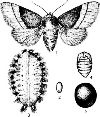 释义 | 扁刺蛾 【学名】 Thosea sinensis Walker。 【别名】 黑刺蛾。 【分布与为害】 分布浙江、江苏、上海、安徽、山东、河北、辽宁、吉林、江西、湖北、湖南、四川、云南、广东、广西、台湾等地。寄主有栀子花、牡丹、石榴、樱花、桃花、西府海棠、月季、山茶等。2龄幼虫开始食叶肉,3龄后咬食叶表皮成穿孔,5龄后大量蚕食叶片,为害严重。体有毒毛,人体皮肤接触后有刺痛感或红肿。 【形态特征】 成虫体长14~17.5毫米,展翅26~38毫米。头灰褐色。复眼黑色。体翅均为灰褐色。前翅自前缘中央偏翅尖部向后缘中央有1褐色线,横脉纹为暗色圆点。后翅暗灰褐色。卵扁平,椭圆形,长径1.2~1.4毫米,背面隆起,淡黄绿色。老熟幼虫扁平,长圆形,体长22~26毫米,体色翠绿,背中央有1白色线条,第四节背面有1对红色点。背侧枝刺不发达,腹侧第一至九节刺枝发达,上生多数刺毛。蛹近纺锤形,长11.5~ 15毫米,黄褐色。茧近圆球形,暗褐色(图9-106)。 图9-106 扁刺蛾 1.成虫 2.卵 3.幼虫 4.蛹 5.茧 【生活习性】 1年2代。以老熟幼虫在浅土层结茧越冬。翌年4月下旬开始化蛹,5月中、下旬开始羽化,至6月中旬为产卵盛期,6月中、下旬幼虫孵化。幼虫共8龄。7月下旬至8月上旬结茧化蛹,8月间出现第一代成虫,羽化,产卵。卵散产于叶背面,1周后出现第二代幼虫,至9月底10月初幼虫老熟下树结茧越冬。在江苏,9月底羽化为第三代成虫,产卵后1周孵化为幼虫,10月下旬进入越冬。 卵期1周左右,幼虫历期1个月,蛹期7~20天。 【防治方法】 冬季在寄主根际周围挖土灭蛹。点灯诱杀成虫。幼虫为害之初,选喷1次90%敌百虫1000倍液,10%安绿宝乳油2000倍液,或Bt乳剂500倍液。 |