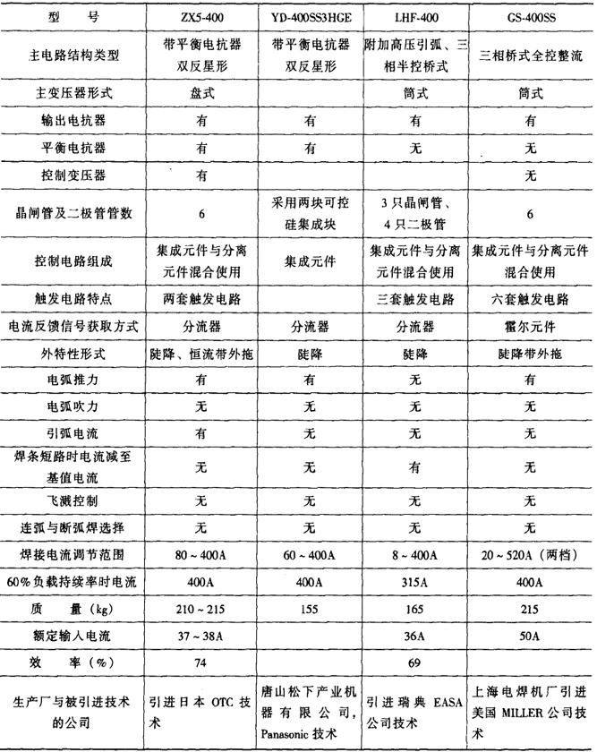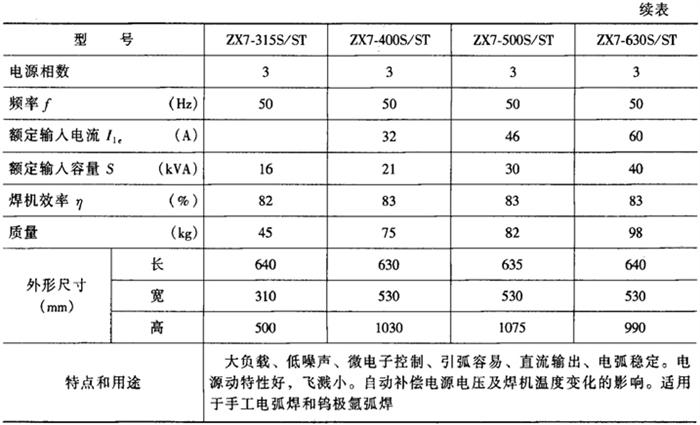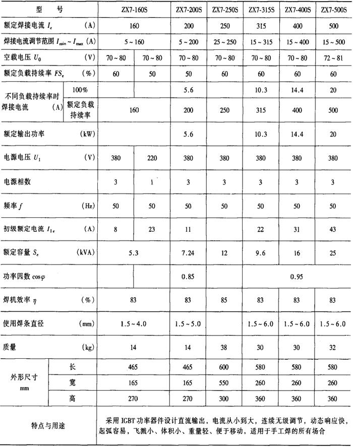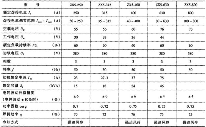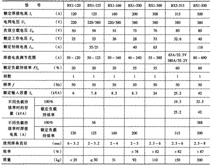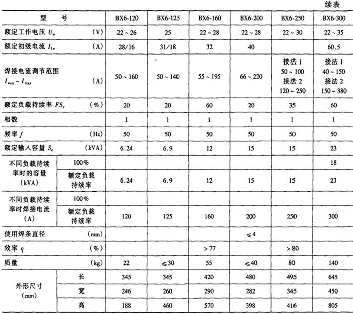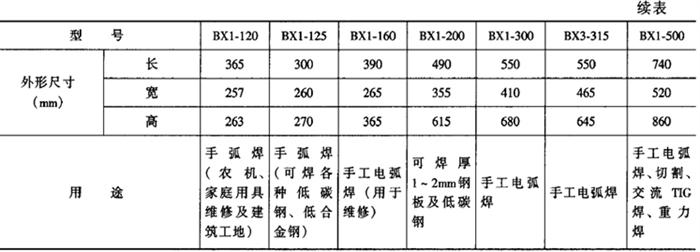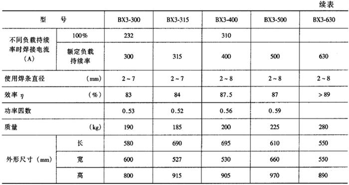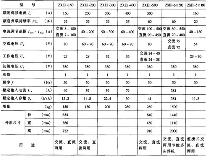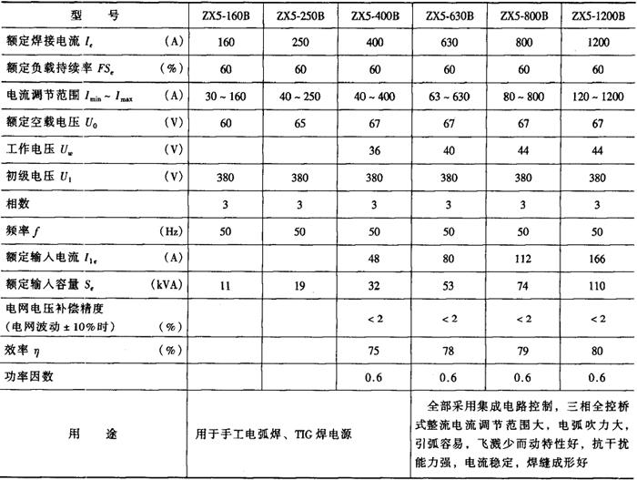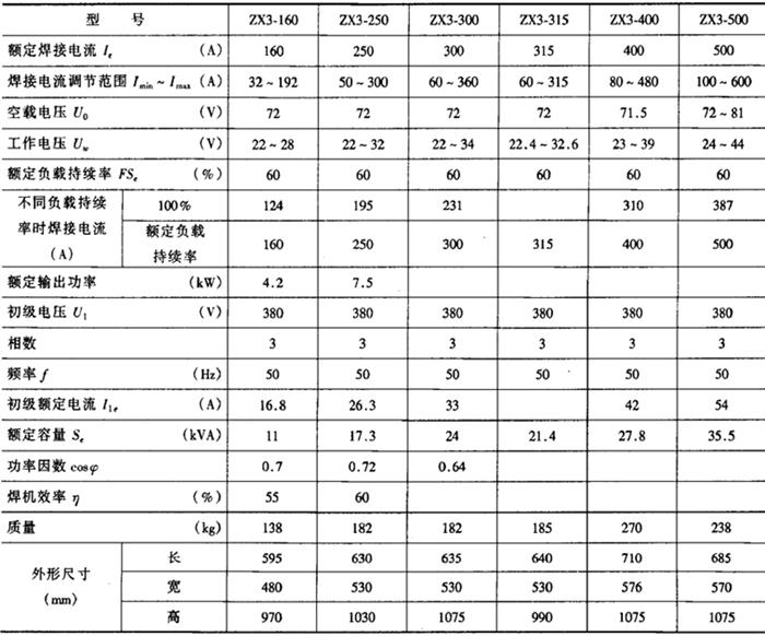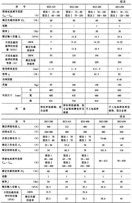 释义 | 手工电弧焊设备 手工电弧焊设备中所用的电源是额定电流在500安以下的弧焊电源。目前,我国手工电弧焊机主要有交流弧焊电源、直流弧焊电源、弧焊逆变电源三大类。 1.手工电弧焊电源的特点 (1)交流弧焊电源 手工电弧焊中的交流弧焊电源根据输出电流波形的不同有弧焊变压器和矩形波交流弧焊电源两种。 弧焊变压器输出正弦交流电。它由初、次级线圈相隔离的主变压器以及所需的调节和指示装置组成,将电网的交流电变成适合于焊接的低压交流电。这种变压器一般为单相供电,适用于用酸性焊条焊接一般的焊接结构。电源下降外特性的获得靠在变压器次级回路中串联交流电抗器或增加变压器自身的漏磁实现。 矩形波交流弧焊电源利用半导体技术来获得矩形波交流电流,由于电流从正变为负或从负变成正时速率快,从而电弧稳定性好;其次,电流波形为矩形波,它的可调参数多,功率因数高。它除了用于用酸性焊条焊接普通结构钢外,甚至可代替直流弧焊电源用碱性焊条焊接难焊材料,获得高质量的焊缝。 (2)直流弧焊电源 手工电弧焊中使用的直流弧焊电源按结构形式和获得直流输出的原理不同可分为直流弧焊发电机、硅二极管式弧焊整流器、晶体闸管式弧焊整流器。近年来,由于电力电子技术的发展,弧焊整流器电源已经成为直流焊机的主流,而电动机驱动的直流弧焊发电机已经不再生产,逐渐被淘汰。 (3)逆变弧焊电源 逆变弧焊电源是近20年来随着电子技术的发展而发展起来的新型电源。它是将电网输送来的交流电通过整流电路整流成直流,再通过由电子开关元件组成的逆变电路将直流电变成高频交流电。然后再通过高频变压器将电压降到适合焊接所需的电压。然后直接输出交流方波信号或通过整流变成直流再输出。在逆变电源中,流过变压器的是高频电信号,由于其频率高,从而使变压器铁心的尺寸减小,整个逆变电源体积变小,重量减轻,因此,特别适宜作为流动工作场合的电源。 2.常用手工电弧焊机类型及其应用 (1)弧焊变压器 手工电弧焊使用的交流弧焊电源主要是弧焊变压器。根据获得下降外特性的方式不同,弧焊变压器可分为增强漏磁式、串联电抗器式等类型,但目前生产和使用的主要是增强漏磁式弧焊变压器。增强漏磁式弧焊变压器是靠增加变压器初、次级之间的漏磁来获得电源的下降外特性,通过改变初次级绕组之间的漏磁来调节焊接规范参数。这类变压器主要有动铁心式、动圈式和抽头式三种。 ①动铁心式弧焊变压器 动铁心式弧焊变压器的型号是BX1,它靠在初级绕组W1、次级绕组W2间增加一个活动铁心作为磁分路来增加漏磁,加大电抗,从而获得陡降外特性,其结构如图1-2-1所示。在变压器窗口中移动动铁心,可改变漏抗,调节焊接规范。 图1-2-1 动铁心式弧焊变压器结构[11] 动铁心有矩形和梯形两种形式,如图1-2-2所示。矩形动铁心移动时,动铁心与静铁心之间的间隙不变,只是动铁心的导磁面积改变,这样变压器漏抗变化范围小,焊接规范可调范围窄。梯形动铁心移动时,不仅动铁心的导磁面积改变,而且动铁心与静铁心之间的间隙变化,这样变压器漏抗变化范围大,焊接规范可调范围大,并且可较均匀地进行线性无级调节,但加工较复杂。 图1-2-2 不同形式动铁心与静铁心配合示意图[12] (a)梯形动铁心与静铁心配合示意图 (b)矩形动铁心与静铁心配合示意图 动铁心式弧焊变压器的特点是:动铁心振动较小,引起的电流波动小,电弧较稳定。但由于活动铁心的存在,磁路内有空气隙,所以杂散磁通引起的损耗比较大。这类变压器由于内部漏抗足够大,不必用电抗器,从而节省了原材料的消耗。 动铁心式弧焊变压器主要性能如表1-2-45所示。 表1-2-45 动铁心式弧焊变压器主要性能 ②动圈式弧焊变压器 动圈式弧焊变压器是另一种增强漏磁式弧焊变压器,其型号是BX3。它的结构示意如图1-2-3所示。它的结构特点是铁心形状高而窄,两侧心柱上都套有初级绕组和次级绕组。初级绕组和次级绕组各自分开缠绕。初级绕组在下方固定不动,次级绕组在上方是活动的,摇动手柄可使其沿铁心柱上下移动,以改变其与初级绕组间的距离。由于铁心窗口较高,绕组间距可调范围较大,使得初级绕组和次级绕组之间磁的耦合不紧密而有很强的漏磁,由此所产生的漏抗就足以得到下降外特性,而不必附加电抗器。 图1-2-3 动圈式弧焊变压器结构示意图[12] Ⅰ.初级绕组(固定) Ⅱ.次级绕组(可动) 1.手柄 2.调节螺杆 3.铁心 动圈式弧焊变压器突出的优点是没有活动铁心,避免了由于铁心振动所引起的小电流时电弧不稳等一系列弊端。虽然初、次级绕组之间也有电磁力作用,但却小得多,几乎不引起危害,且当调至小电流时,绕组间距最大,电磁力更小,故电弧稳定。但是电流调节下限受到铁心高度的限制,因而电流调节范围较窄;常用改变绕组匝数来扩大电流调节范围。与动铁心式弧焊变压器相比,它调节电流不方便,消耗电工材料较多,经济性较差,一般作为中等容量电源。动圈式弧焊变压器产品的主要性能参数如表1-2-46所示。 表1-2-46 动圈式弧焊变压器产品的主要性能参数 ③抽头式弧焊变压器 抽头式弧焊变压器的型号是BX6,其结构如图1-2-4所示。在两侧心柱Ⅰ、Ⅱ之间设有磁分路Ⅲ,铁心Ⅲ固定不动。初级绕组分为两部分,绕在心柱Ⅰ的W1I和绕在心柱Ⅲ上的W1Ⅲ。次