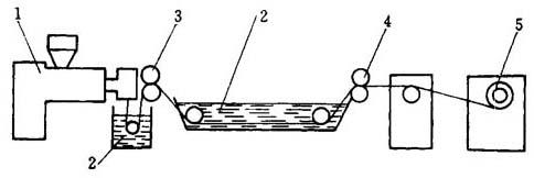 1-挤出机 2冷却水槽 3-拉伸机 4-热风循环炉 5-收卷机