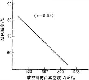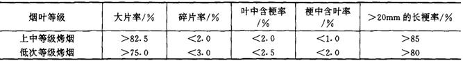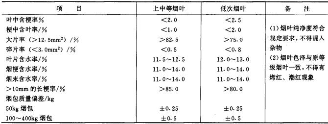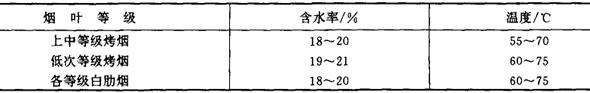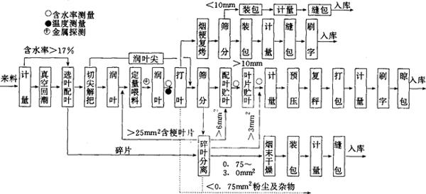 释义 | 打叶复烤工艺 (一)打叶复烤工艺流程 打叶复烤有全叶打叶与切尖打叶两种工艺。切尖打叶可减少打叶负荷,但多了切尖与润叶尖工序。流程基本相同。见图7-1-2所示。 图7-1-2 打叶复烤工艺流程图 (二)打叶复烤成品主要质量指标 1.打叶复烤成品主要质量指标(表7-1-3) 表7-1-3 打叶复烤成品主要质量指标 2.叶片包装 叶片包装可分为麻袋包装、纸箱包装、夹板包装等数种形式。无论采用何种包装,均要求包体端正、包皮平整、捆扎牢固、不漏烟叶、不露内衬;其包装重量偏差,应不超过允许范围。 (三)预回潮工序 1.工艺任务 增加烟叶含水率,提高烟叶温度,减少解包与加工过程中烟叶造碎(当气温较高,原烟叶含水率大于17.0%,且无结饼现象,则可不进行预回潮,直接解包与切尖解把)。 2.质量指标 原烟预回潮后含水率为17%~19%(即烟叶含水率增加1%~2%),烟叶温度不超过70℃,烟叶回透率大于98.0%,并无水渍烟叶现象。 3.加工方法 一般采用真空回潮机回潮。当回潮筒内真空度达到一定值后放汽喷水,借助烟包内外的压力差与温度差,蒸汽渗透到烟包内,并冷凝于烟叶上而使烟叶升温回潮。 4.技术条件 (1)蒸汽压力、水压及压缩空气压力应符合工艺要求;冷却水初始温度不应超过32℃,排水温度不应高于42℃。 (2)筒内最高真空度为99.5%以上;放汽回潮采用饱和蒸汽,喷水时水应雾化。 (3)送入回潮筒内的烟包不得与筒体接触,以免筒壁上的水浸渍烟叶;回潮后的烟叶不得封存在回潮筒内,也不宜长时间存放,以免影响烟叶色泽与质量。 5.设备性能要求 (1)回潮筒体及与其连接的管道和阀门的密封性能良好,不得有漏气(汽)现象存在。 (2)真空设备性能稳定;筒内真空度、温度、汽压、水压等检测仪表齐全,显示准确;设备具备自动和手动两种操作方式;回潮周期能按实际需要选定,并具有记录功能。 (3)真空阀、汽阀及水阀启闭灵活,回潮筒密封门及托板(或烟包车)运转平稳,安全可靠。 6.技术要点 (1)烟包回透率的高低,主要取决于筒内真空度的高低。第一个周期回潮抽真空时,筒内真空度必须达到99.5%以上。 (2)对于包装密度较小、含水率增加较少的原烟烟包,一周期回潮即可达到质量要求;对于包装密度较大,且含水率增加较多、而回潮后烟包温度又要求较低时,需选用2~3周期回潮方可达到质量要求。 (3)破真空之前筒内真空度越高,则烟包温度越低,见图7-1-3所示。 图7-1-3 破空前筒内真空度与烟包温度的关系 (四)选叶配叶工序 1.工艺任务 (1)挑出原烟中的杂物及霉变烟叶,提高烟叶纯净度。 (2)按照分级标准将原烟进行挑选,并按照卷烟叶组配方要求进行批量配叶(或将小等级烟叶搭配成使用等级的烟叶)。以稳定卷烟质量,减少库存烟叶等级,并可简化卷烟加工过程的配叶工艺。 2.质量指标 (1)原烟重新分选后,其等级纯度允差,上等烟叶不宜超过5%,中等烟叶不宜超过10%;低次烟叶不宜超过15%。 (2)对于采用切尖打叶工艺加工的烟叶,配叶后仍应整齐排列,不得零乱。 3.加工方法 手工操作。 4.技术条件 选叶房夏季温度应符合《工业企业设计卫生标准》要求,冬季为22~25℃为宜;相对湿度以65%~70%为宜。 (五)切尖解把工序 1.工艺任务 从烟叶上切下烟梗直径小于1.5mm的叶尖部分。如加工未选叶的把烟,切尖前还需挑选出等级不符合规定的烟叶、霉变烟叶及杂物,切尖后解开烟把。 2.质量指标 (1)切尖后叶尖含梗率(>1.5mm烟梗)不宜大于1.5%; (2)对于加工未选叶的把烟,解把率应大于80%。 3.加工方法 按照核定的烟叶流量,分批次将烟叶均匀整齐地摆放在铺叶带上,定位切尖。切尖方式可以叶尖摆整齐后切割,或以叶柄(或把头)摆整齐后切割。对于把烟的解把方式可用低速打辊解把,也可用辊刀竖切把头后搓开烟把。 4.技术条件 (1)来料烟叶含水率一般均为16%~18%。 (2)摆放在铺叶带上的烟叶与流动方向垂直,叶尖方向一致,均匀整齐。对于把烟应间隔均匀,无横把、倒把、斜把和叠把现象。 (3)切尖刀刃锋利。解把辊刀刀刃高出刀辊0.5~0.8mm。 5.设备性能要求 (1)铺叶带输送速度与挡板位置均可根据烟叶尺寸进行调整。 (2)切尖时烟叶能定位输送;切尖刀片可自动磨削,确保刀刃锋利。 (3)辊刀解把的刀辊高度可随着烟叶把头的大小变化而自动调整。 6.技术要点 (1)根据来料情况与叶尖含梗率要求,确定切尖长度,调整铺叶带挡板位置。 (2)利用辊刀解把,应确保辊刀刀刃压切在烟叶把头上,以提高解把率。 (六)润叶工序 1.工艺任务 提高烟叶温度,增加烟叶含水率,改善烟叶的抗破碎性能,以适应打叶加工的需要。 2.质量指标 (1)经第一次润叶后,烟叶(叶基)宜达到下列工艺指标:上中等级烤烟含水率为17.0%~19.0%,温度为55~70℃;低次等级烤烟含水率为18.0%~20.0%,温度为60~75℃;各等级白肋烟叶含水率为17.0%~19.0%,温度为60~75℃。 (2)经第二次润叶后,根据车间温湿度条件及烟叶性能,其工艺指标可在下列范围选取;上中等级烟叶含水率为18.0%~20%,温度为55~70℃;低次等级烟叶含水率为19.0%~21.0%,温度为60~75℃;各等级白肋烟叶含水率为18.0%~20.0%,温度为60~75℃。 3.加工方法 一般采用滚筒式热风润叶机进行加工处理。烟叶在滚筒内翻滚向前运动的过程中,滚筒两端通过喷嘴将蒸汽与水雾均匀喷射在烟叶上;筒内热风循环;可提高烟叶温度,加速烟叶吸收水分。 4.技术条件 (1)来料烟叶流量均匀,符合工艺制造能力;解把率达到80%以上。 (2)蒸汽压力,水