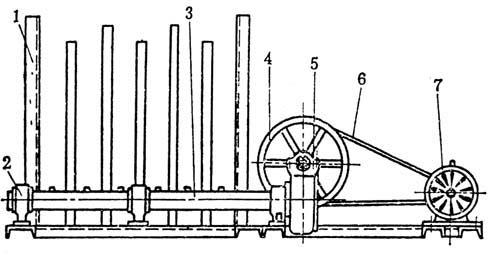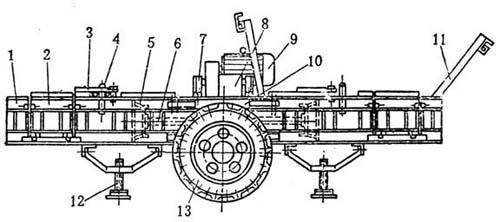 释义 | 打捆机械设备 1.人工打捆机 (1)工作原理 通过人工压杆或绞紧棘轮转动滚杆,使钢丝绳缠紧勒压草箱中的散草后,再用人工结紧捆绳,打成草捆,出箱、堆垛。 (2)结构 人工打捆机的结构有以下4个部分。 草箱:由角铁,槽钢或钢管焊制而成。 传动部分:Dg50mm钢管制的人工压杆,两端带环的钢丝绳。 齿轮传动:用压杆绞动棘轮,绕紧钢丝绳捆紧草包。 滚杆捆紧:通过一级齿轮传动带动滚杆压缩散草,打成捆包。 (3)主要技术特征 型式:立式钢质立柱(散草箱)。 定员:2~4人(两对压杆)。 外形尺寸:1400×900×1300mm。 打捆规格:1400×400×300mm。 平均捆重:30kg,班效率70~90捆。 钢丝绳:直径7.7mm,长4.7~5m,每台5根。 (4)特点 ①结构简单,操作方便,制造维修容易,故障少。 ②劳动强度大,效率低,捆包质量差,捆重小。 2.立式电动捆包机 (1)工作原理 由电动机带动三角皮带轮传动使滚杆转动,缠紧钢丝绳,将草箱散松草压紧,人工结绳捆包成草捆。 (2)结构 图6-1-1 立式电动捆包机 1-苇箱 2-瓦座 3-滚杆 4-皮带轮 5-蜗轮减速箱 6-三角带 7-7.5kw电动机 由动力、传动系统、机架三部分组成。 动力:7.5~10kW电机。 传动部分:一级三角带,一级蜗杆,蜗轮传动,滚杆与蜗轮同轴传动。 机架:由槽钢焊接的草箱和电机底座组成。 附件:6根5m长钢丝绳及手钩。 (3)主要技术特性 外形尺寸:3050×1450×1400mm,重950kg。 动力:7.5~10kW,C型三角带。 蜗轮减速箱传动比1:40,滚杆转速75r/min。 生产效率:每班可捆包160~200捆,平均捆重35kg。 优点:设备性能稳定,结构简单,操作方便,草捆头齐,面光,合格率高,并能降低劳动强度,提高捆重。 缺点:蜗轮易磨损,草捆出箱困难,移动费力。 图6-1-2 卧式电动捆包机 1-苇箱 2-苇箱侧门 3-压把 4-压钩 5-推板 6-丝杠 7-轴承座 8-传动箱 9-10kW电机 10-主机架 11-苇箱盖 12-螺纹升降式支架 13-轮胎 3.卧式电动捆包机 由吉林白城地区研制,已在黑龙江、辽宁等地推广应用。 (1)结构 主要由电机传动,挤压草箱,移动装置等部件组成。 (2)主要技术特性 型式:卧式移动式,动力10kW电机; 外型尺寸:3900×2180×1250mm,重2t; 草捆尺寸:1400×400×300mm; 捆重:37~45kg; 丝杆行程:1100mm(需时间40s); 工作效率:40~50捆/h,每台6人。 生产效果:质量好于人力和立式捆包机。草捆质量基本达到捆紧、包小、方整、实重、头齐、面光,有利堆垛、贮运。 优点:劳动强度低,捆重增加,结构简单,制造方便,效率高,成本低,移动方便,节省钢丝绳。 缺点:设备笨重,压力轴承易磨损。 4.芦苇连续打捆机 为提高机械打捆草包的重量和效率,增加车辆装载量,黑龙江造纸芦苇公司等单位研制成了芦苇连续打捆机。 (1)结构 由动力传动进料运输,一级压缩,二级压缩,缠结绳,切割卸料及移动拖车等8个部分组成。 芦苇经过进料运输机通过出料口,输送到一级压缩,二级压缩,压缩出来的芦苇密度接近581kg/m3,而后用苇绳或草绳,每间隔250mm自动绕绳打结,最后每隔1250mm间距用圆盘锯(Φ1000mm,1000r/min)切割落下。草捆由皮带运输机运出,堆垛、运输或贮存。 (2)特点 ①整机安装在拖车上,由拖拉机拖动。 ②动力可由电动机传动,也可由拖拉机传动。 ③为防寒防砂,各润滑部都做好了密封。 ④连续打捆,自动结捆。 ⑤整机较长,过重,运转移动时可分为两节。 (3)主要技术特性 主机重:15t; 外形尺寸:6000×3350×3000mm; 动力:采用8级46kW电机,东方红75型拖拉机; 进料口:800×670mm,进料速度5m/min; 一级压缩出口:260×670mm; 二级压缩出口:270×280mm,压强2.78MPa; 绕绳器转速:60r/min; 叉绳器前后移动:203.3mm; 图6-1-3 芦苇连续打捆机 打结钩子转动次数:20次/min; 切割速度:4次/min,每捆切割4s停1s,指圆锯4s,出草捆6s,全程15s; 草捆尺寸:1250×350×300mm; 草捆实重:50~55kg,密度437kg/m3; 时产捆数:240捆(13t); 班产效率:1920捆(105.6t)。 表6-1-1 草类捆包机械技术规格 |