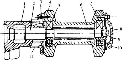 释义 | 托带轮 托带轮用来托住履带上方区段,防止履带下垂过大而引起振跳和侧向滑脱。东方红-75、802型拖拉机的托带轮如图4-25所示。它是整体铸钢件,通过2个向心球轴承安装于托带轮轴上,其内端装有端面油封,外端有托带轮盖,盖上设置注油螺塞,工作中用机油润滑,托带轮轴固定在车架上。 图4-25 东方红-75、802型拖拉机托带轮 1.托架 2.托带轮轴 3.密封壳 4.端面油封 5、7.向心球轴承 6.托带轮 8.托带轮盖 9.螺帽 10.加放油螺塞 11.密封罩 |