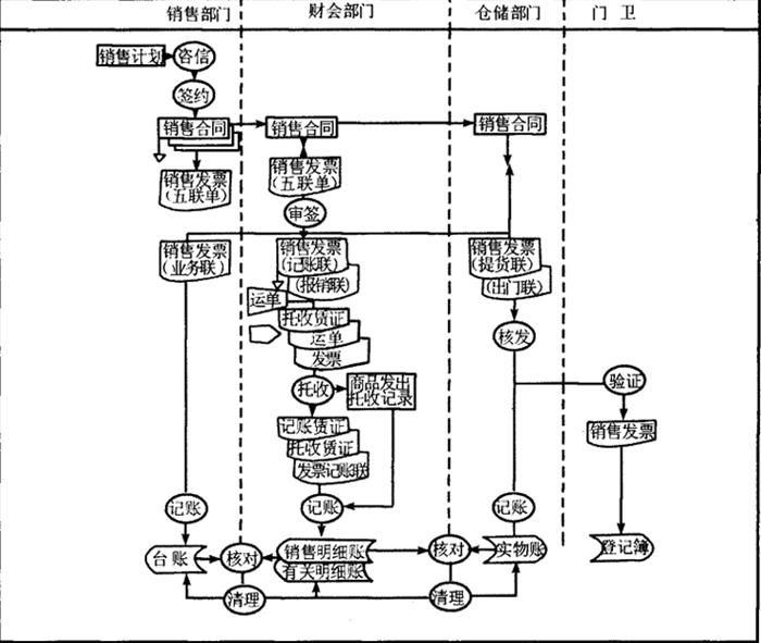 其具体销售流程主要如下:编制计划、办理订单、调查信用、审批订单、签订合同、登记销货、开具发票、审签发票、交发货物、验证、托运货物、托收货款、处理退货、制证记账、核对账簿、清理欠款。