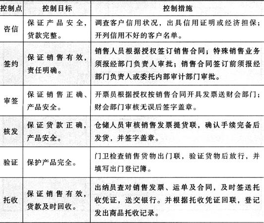 为了实现上述控制目标,应该在产品销售系统中相应地设置下列控制点和关键控制点:咨信、签约、审签、核发、验证、托收、记账、核对、清理。其中,托收、记账和核发为关键控制点。