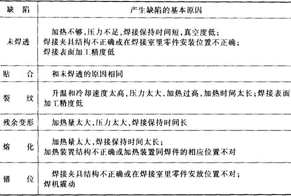 扩散焊接头的主要缺陷为未焊透、裂纹、变形等,产生的影响因素也较多。表7-60列出常见缺陷及主要原因。