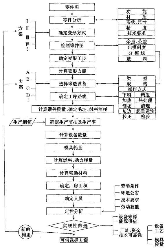 释义 | 技术经济分析步骤 8.5.3.1 工艺方案的分析 工艺分析是工艺方案的技术经济分析的首要和基础环节,工艺分析的目的是探寻、确定加工方法,为技术经济分析和选择最佳工艺方案准备条件.锻件工艺分析步骤如图8-51所示. 按图8-51所示步骤分析结果,可得到可选择的工艺方案,为技术经济分析打下基础. 在工艺分析过程中要特别注意锻造方法的选择.同一锻件可由多种方法锻造出来,但其经济效果有很大差别. 另外还要考虑锻件结构的经济性,注意锻件与零件的接近程度,这对零件生产经济性影响较大.锻件与零件的接近程度与工艺方法有关,与生产批量和总成本有关,如图8-52所示. 8.5.3.2 设备选用分析 锻件在实际生产中是多种设备的组合,某一个锻件可以在几个不同的设备上锻造出来.在选择设备时应按生产单位总成本最低的原则进行选择,其分析步骤用图8-53表示. 选用设备要特别注意经济效益,但也必须考虑实际情况.经济地选用设备应注意以下几个方面: 根据锻件变形特征,选择匹配设备;选用节能、劳动条件好、公害少、易操作设备.同时考虑在满足锻件质量和产量大小的前题下,选用工艺路线短、工序集中的设备;结合当时、当地的具体条件,得到最佳的选用方案. 8.5.3.3 能源与动力分析 锻造生产使用能源包括锻件毛坯加热用燃料和驱动设备,以及生产中必须消耗的能源. 动能源主要有电、蒸气、压缩空气、生产用水等. 我国目前能源紧张,与国民经济发展的需要有较大的矛盾.技术经济分析的主要目的就是节能,降低锻件生产成本. 目前减少燃耗的主要措施有:合理选择燃料、选择炉型及规格、余热利用、加强管理及先进锻件设计和工艺设计. 选择燃料要注意热效率.电加热的热效率最好,可达50%~60%;煤气加热热效率为20%;燃油加热热效率为7%;煤加热热效率只有5%,要结合实际情况综合考虑. 减少动力消耗的主要方法是选好节能锻造设备.随着技术不断发展,新设备越来越多,将会实现合理用能、节约能源的目的.同时要加强管理,防堵漏洞,建立有关制度. 图8-51 工艺分析步骤 图8-52 成本、批量与锻件接近程度关系示意图 |