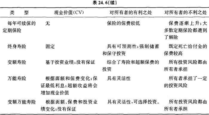 释义 | 投资型寿险 保险和投资是截然不同的概念。这种区别导致了各种保险产品和投资产品的发展。然而在实践中,一些类型的保险产品和投资产品具有重叠性。这种重叠的发生部分是由于投资型寿险产品所被赋予的特定税收优势。两种主要类型的投资型寿险是现金价值寿险和年金。 本章从保险的概观开始,剩余部分考虑了主要类型的投资型寿险,即现金价值寿险和年金。 保险 保险被定义为一方——被保险人——基于某个未来的或有事件用一笔小额的确定成本(保费)代替大额的不确定经济损失的合同。因此,保险合同有两个当事方:支付保费并获取保护的被保险人和收取保费并提供保护的保险人(或保险公司)。(1) 大多数类型的保险都规定了在或有的被保险事件发生时由保险人向被保险人支付一笔预定款项,在其他情况下则不具价值。这被称为纯保险。其他类型的保险即使在或有事件不发生时也具有“现金价值”。这被称为投资型保险。我们将在后面讨论两种类型的投资型保险。 一般而言,主要类型的保险有:(2) □ 寿险 □ 健康险 □ 残疾险 □ 财产险(住宅和汽车) □ 责任险 在这些类型中,只有寿险在纯保险外还有一种现金价值形式。现金价值寿险是一种十分重要的投资型寿险。因此,让我们更详尽地考虑寿险。 根据纯寿险合同,保险人(人寿保险公司)在寿险合同有效期间被保险人死亡时向合同受益人支付一笔固定的金额。假如被保险人在保险单的有效期内未发生亡故,那么保险合同在到期时将一文不值。为了提供纯寿险合同,保险公司——具体而言,其精算师——会计算被保险人在合同有效期内的死亡概率。许多变量会影响这个概率,包括身体健康状况和被保险人是否吸烟。然而,最重要的变量是被保险人的年龄。具体而言,死亡概率随着年龄上升。精算师以一定的精确度估计这个关系。 显然,保险公司收取的保费必须抵补其向所有被保险人支付的平均金额、管理成本和销售成本,以及利润。公司的纯保险成本取决于被保险人在合同有效期内的死亡概率,这个概率随着年龄上升,正如图24.1显示的那样。 图24.1 死亡概率(美国人口,男性) 图24.2显示了总体而言,被保险人在纯寿险合同中被收取的保费。这笔保费是由死亡概率(支付死亡给付金的“成本”)、销售成本和管理成本以及利润决定的。纯寿险被称为定期保险。它在保险单的期限内适用。 图24.2 每年可续保的定期保险单的年保费 定期保险有三种类型。最常见的类型被称为每年可续保的定期保险。根据这种类型,被保险人有权每年在不重新经历审批(即不重新进行医疗检查)的情况下续保。然而,保费会发生变化。即,它们逐年上升,并在被保险人年迈时变得十分昂贵,正如以下显示的那样。第二种类型的定期保险较不常见,它不具有上述的保证可续保特征。 第三种类型的定期保险为等额保费定期保险,其保费在保险单的期限内固定不变,保费水平高于每年可续保的定期保险在保险单早期的保费。然而,保费不随着年龄上升,并且低于每年可续保的定期保险在保险单晚期的保费水平。通常,10年或10年以上的保险单是以等额保费定期保险的方式签订的。 正如我们指出的那样,对每年可续保的定期保险而言,每年的保费随着年龄显着上升。例如,对一位30岁的非吸烟男士的100万美元的定期保险单而言,20年期等额保费保险单(它在该男士50岁时终止)的保费大约为500美元。在该男士50、60和70岁时,他将分别为相同类型的20年期保险单支付大约2500美元、6000美元和20000美元。(3)这些保险单的保费根据不同的发起公司有很大差别。 传统终身寿险单的保费远远高于定期保险,通常要高出10倍以上。例如,一位非吸烟的40岁男士也许会为传统的终身寿险单每年支付大约16000美元。在这种保险单中,保费也根据不同的公司有很大差异。 非人寿型的纯保险的费用是用类似的方式确定的。然而,在其他类型的保险中,被保险人年龄以外的因素也许是主导变量。例如,地理位置在住宅保险中也许十分重要:在迈阿密和加尔维斯敦投保飓风险要比在芝加哥和旧金山更为昂贵。一位年轻男士(年龄在这里也是一个因素)购买汽车险的费用要高于中年女士的保费。然而,对两者而言,过去的驾驶记录都十分重要。 风险管理中的概念性问题 让我们从被保险人的角度考虑风险管理方面的一些概念性问题,并从保险人的角度考虑其提供风险保险的意愿方面的一些概念性问题。 从被保险人的角度来看,保险是一种管理风险的机制。个人会经历许多类型的风险,其管理风险的方式取决于风险的特征。风险的两个重要特征是风险的严重程度(成本)和风险的频率。 一般而言,我们有四种不同的风险管理方式。让我们在管理房屋的火灾风险的背景下具体考虑这四种方式。 □ 避免:避免产生风险的活动。例如,不在炎热、干燥的地区建造房屋。 □ 降低:降低活动的风险。例如,在炎热、干燥的地区建造房屋,但添加一个喷洒系统。 □ 保留:继续开展产生风险的活动,但不为风险保险,即自我保险。例如,在炎热、干燥的地区建造房屋,不购买保险,但准备好在住宅焚毁时自己为房屋买单。 □ 保险:为这种风险签订一份保险合同,并在此后支付保费。例如,为你的房屋购买火灾险。然而,在炎热、干燥地区的房屋火灾险将十分昂贵。 个人管理风险的
