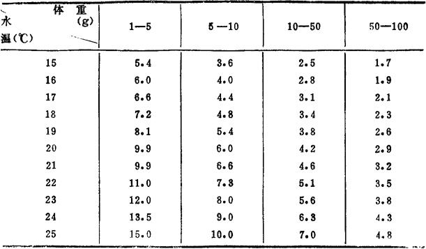 根据投饵率和所喂鱼的体重计算日投饵量。水温、体重与投饵率的关系见表28—2。具体投饵量还要视鱼种吃食情况灵活控制,以大多数鱼种吃饱游走为宜。