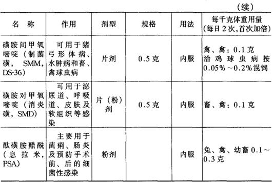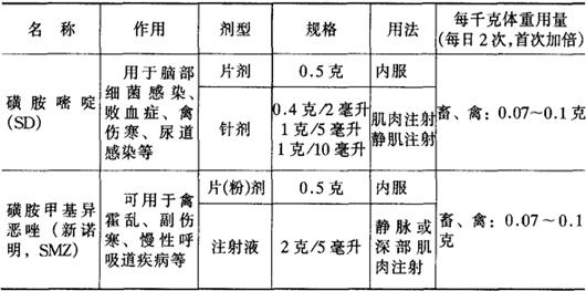 释义 | 抗微生物药 是某些微生物的代谢产物。它通过改变病原体的结构和干扰其代谢过程,抑制或杀灭病原体。 (1)抗菌药 分为繁殖期杀菌剂(包括青霉素类、先锋霉素类、万古霉素类等)、静止期杀菌剂(包括链霉素、卡那霉素、庆大霉素、杆菌肽等)、快效制菌剂(包括氯霉素、红霉素、四环素类等)和慢效制菌剂(包括磺胺药、环丝氨酸等)。为增强抗菌效果,在用药时应尽可能多地将繁殖期杀菌剂与静止期杀菌剂、快效制菌剂与慢效制菌剂联合应用。 青霉素:主要有青霉素G钾或钠、氨苄青霉素、普鲁卡因苄青霉素等,适用于猪丹毒、炭疽、破伤风、链球菌病、葡萄球菌病、钩端螺旋体病、禽霍乱、各种败血症等。 青霉素G钾(钠)粉针,有20万、40万、80万、100万国际单位等规格,用前以注射用水或生理盐水溶解。肌肉注射用量:牛、马0.5万~1万国际单位/千克体重;羊、犬、猪1万~1.5万国际单位/千克体重;家禽5万国际单位/只·次。间隔8~12小时注射一次。 氨苄青霉素,片剂为0.25克/片,马、犊、猪、羊4~12毫克/千克体重,犬、猫11~22毫克/千克体重,每日内服2~3次;禽5~20毫克/千克体重,每日内服1~2次。粉针每支0.5克,马、猪、牛、羊每日按4~15毫克/千克体重肌肉、静脉注射2~4次;鸡每日按25毫克/千克体重肌肉、皮下注射3次。 普鲁卡因苄青霉素粉针,每支40万国际单位、80万国际单位,马、牛、猪、羊、犬按1万~2万国际单位/千克体重每日肌肉注射1次;鸡2万~5万国际单位/只、鸽1万~2万国际单位/只,每日肌肉注射2~3次。 头孢菌素:又称先锋霉素,有Ⅰ、Ⅱ、Ⅳ等,主要适用于呼吸道和泌尿道感染。Ⅰ、Ⅱ为粉针,每瓶0.5克。肌肉注射,Ⅰ给马、牛按25毫克/千克体重·次,每日3次,家禽按10毫克/千克体重·次,每日4次;Ⅱ给犬、猫按11毫克/千克体重,每日肌肉、皮下注射2次,疗程不能超过7日。Ⅳ为结晶粉末,给家禽按每日35~50毫克/千克体重内服,大家禽分4次服用,小家禽分8~10次服用。同时给禽内服丙磺舒,效果更好。 链霉素:主要对结核、牛出败、猪肺疫、禽霍乱、仔猪白痢、子宫炎、鹅卵黄性腹膜炎、钩端螺旋体病等有治疗作用。硫酸链霉素粉针每支0.5、1、2克。家畜按10毫克/千克体重、家禽50~200毫克/只,肌肉注射每日2次。 卡那霉素:主要用于禽霍乱、雏鸡白痢、呼吸道和泌尿道感染等。硫酸卡那霉素注射液每支0.5克/2毫升,粉针剂每瓶0.5、1克,兽用卡那霉素注射液(猪喘平注射液)每支1克/10毫升。肌肉注射,每千克体重猪、马、牛、羊10~15毫克,家禽10~20毫克,每日2次;犬、猫5毫克/千克体重,每日3次。5天为一疗程。 庆大霉素:主要适用于乳腺炎、败血症、泌尿道和呼吸道严重感染等。硫酸庆大霉素片剂,每片20毫克,幼畜每千克体重2~4毫克每日内服3~4次。注射液每支20毫克/5毫升、40毫克/10毫升、80毫克/20毫升。家畜按每千克体重1~2毫克、家禽每千克体重3毫克肌肉注射,每日2次。 氯霉素:主要适用于仔猪白痢、副伤寒、巴氏杆菌病以及乳腺炎、子宫炎、传染性角膜炎、腐蹄病等疾病的防治。片剂每片0.05、0.1、0.25、0.5克,内服,家畜每千克体重50毫克,家禽每只0.1克,每日2次;针剂每支含0.125克、0.25克、1克,按每千克体重家畜10~30毫克、家禽20~50毫克,肌肉或静脉注射,每日2次。 红霉素:抗菌作用与青霉素G相似,主要用于对青霉素产生耐药性病菌的严重感染,如肺炎、子宫内膜炎、败血症等。片剂,每片0.1、0.2、0.125、0.25克,内服按每千克体重幼畜0.025~0.05克、禽0.01克,每日2次。粉针剂,每瓶0.25、0.3克,溶解后用5%葡萄糖稀释成0.5%注射液,家畜按每千克体重静脉注射2~10毫克,每日2次。 四环素类:主要有氧四环素(即土霉素)、盐酸四环素、氯四环素(即金霉素)等。它们均为广谱抗生素,主要适用于治疗炭疽、巴氏杆菌病、幼畜副伤寒、雏鸡白痢等。片剂或胶囊均为0.125、0.25克。内服,中小家畜按每千克体重10~15毫克,每日2~3次。粉针剂土霉素、四环素均为每支0.125、0.25、0.5克,金霉素每支0.1、0.2克。肌肉、静脉注射量均为:每千克体重马、牛5~10毫克,猪和羊7~15毫克,犬10~20毫克,每日分1~2次使用。鸡每千克体重肌肉注射25毫克。 磺胺类药:抗菌谱广,作用最大的是抑制链球菌、肺炎球菌、沙门氏菌、化脓棒状杆菌、大肠杆菌;其次对葡萄球菌、炭疽杆菌、巴氏杆菌、布氏杆菌等有抑制作用;对螺旋体、结核杆菌无作用。使用时应注意必须配伍等量碳酸氢钠,并增加饮水或静脉补液,以防出现结晶尿、血尿等不良反应。主要磺胺药的名称、作用、用法、用量如表1-7。 表1-7 磺胺药的作用、用法、用量 (2)抗菌增效剂 主要有三甲氧苄氨嘧啶(TMP)和二甲氧苄氨嘧啶(敌菌净DVD)。它们与磺胺药、抗生素联合使用,能显着增强磺胺药和抗生素的疗效、扩大治疗范围,减弱不良反应。TMP与磺胺药按1∶5制成的复方制剂,对畜禽呼吸道、消化道、泌尿道、皮肤、创伤感染均有较好疗效。DVD与磺胺药按1∶5制成的复方制剂在治疗畜禽消化道感染方面比TMP更胜一筹。 (3)呋喃类药 主要有呋喃唑酮(痢特灵)、呋喃妥英(呋喃 |