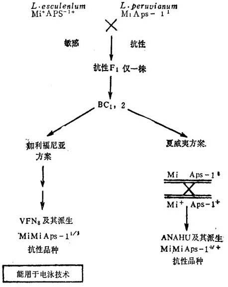 释义 | 抗线虫番茄品种育种 根癌线虫(Meloidogyne spp.)是重要的植物寄生物,已知37个种中,其中7个种是侵染番茄的。以M.incognita,M.javanica,M.arenaria和M.hapla最重要。 严重感染的植物,营养根发育通常受到损伤,激素分布、矿物质转移及光合作用都发生改变,结果使顶端生长变慢,产量降低,高温时,植物枯萎,即使土中有充分水分。 线虫感染引起的经济损失很难估价。据报道夏威夷和墨西哥产量降低75%。在意大利南部、马尔泰和北加罗林那损失估计为50-85%。 此外,线虫感染还使根变得易受其它病原感染,甚至完全丧失抗性。 化学控制是可行的,但花费太贵而且只是意味着减少土壤中接种物的临时解决办法。这样看来,遗传抗性的培育是一个很明智的抗植物寄生线虫的途径,这不仅是经济观点,而且可以避免生态的影响。已知有抗线虫能力的番茄有65种以上的栽培品种,而且无疑还有许多未知的。 (一)线虫抗性的筛选 检查线虫抗性的传统方法,是把幼苗培养在严重感染的土壤中直接观察根瘿的发生。 根据症状的严重程度分级,高度抗性植物通常没有虫瘿,只是偶尔有些小虫瘿,抗性差的植物常出现较多虫瘿。 为了提高筛选效率,对线虫筛选方法作了一些修改。Rick和Fokes(1974)提出了很重要改进。以淀粉凝胶电泳研究线虫的同工酶,发现VFN8和其它5种抗线虫栽培品种一样,在决定酸性磷酸脂酶的座位1上有一个突变,这一等位基因,Aps-1+以前是知道在L.peruvianum中出现,番茄的所有其它栽培品种具有等位基因Aps-1+。以Aps-1-与敏感的Aps-1+杂交,其子代分离为16+/+∶19+/1:101/1。对Aps-1来说,只有在基因型为+/+时,对线虫敏感,Mi与Aps-1之间的关系认为是一个紧密的连锁,或单一基因的多效性。 Meclina-Filho和Stevers(1980)研究来自世界各地的许多栽培品种和培育品系。根据酸性磷酸酯酶的座位1(Aps-1)的基因型,区分园艺学特性和抗性。敏感品系总是纯合的Aps-l+。抗性的自然授粉栽培品系为Aps-l+/+或Aps-11/1,而杂种栽培品种为Aps-1++或Asp-11/1(图12-5)。在所有的情况下,都可以核对抗性的自然授粉品系Aps-1+/+的谱系,起源于番茄×L.peruvianum的一个单个的F1代可能在早期几代,在线虫抗性整合到番茄的过程中,发生了Aps-11和Mi基因的杂交。这就解释了,为什么Aps-1+/+抗性栽培品种,如Anahu,VFN8和它的衍生品系,保持了在L.peruvianum中出现的Aps-l1与Mi联合(图12-6)。 图12-5 番茄品种间Aps-1基因型的带型 图12-6 番茄抗线虫品种的培育 (二)检测Aps-1的方法 Mi与电泳突变体Aps-l1的偶尔联合为番茄线虫抗性的培育提供了新的方法。而这实际上已经被植物育种机构成功地进行应用。 1.电泳装置 Tanksley(1979)设计的装置是利用淀粉凝胶检测同工酶的非常好的系统。为了增加每块胶上的单个标品数量,对原来装置进行了小改动,将胶板宽面部分与缓冲液槽平行。缓冲液槽的尺寸不变,这样可以增加装置的用途,在需要长时间电泳以获得好的分解力时,可以按通常的方式使用。改进后的电泳以T形的电极绵代替原先距形的电极绵,将宽的部分接触胶,这样一来,35根3.2×5.0mm的电极可以插入一块胶板中,而不显得拥挤。可以用更窄的电极进一步增加样本数目,这样情况下带子变窄但乃很清楚,用这种更窄的电极可以在一块胶板上同时检测40种样本(植物)。 2.胶板与电极缓冲液的pH 以一系列胶板与缓冲液的pH的不同组合进行试验,范围以7.0-9.0,间隔为0.4。电极缓冲液为0.3M硼酸盐溶液,以4N NaOH调到所希望的pH。胶板pH可以增加三羟甲基氨基甲烷(Tris)或柠檬酸盐的浓度来进行调整。开始时用25ml0.0152M Tris和25ml0.036M柠檬酸用蒸馏水定容至1000ml的标准溶液,这一办法也改变了缓冲物质的离子强度。 在各种硼酸盐溶液(电极缓冲液),在供试pH值下,谱带的分布及相对于前沿的迁移都没有不同,但是,对通过电流的阻力有明显效果。当缓冲液槽的pH为7.4时,电压要360V才能使电流值达到40mA。在pH7.8,8.2和8.5时,这一数值大约分别为220、210,和190V。在pH较低时,要想通过升高电压加快电泳速度是不能成功的。因为这不可能升高电流值,另外,电压高时,释放的热量大多使胶板质量变差。pH高达8.6时,电压为270-285,电流值可达65mA。在这些条件下,没有多余热量释放,带的分辨力非常好,电泳时间从低pH硼酸盐溶液时的4-5小时降到1.5-2.0小时。 相对迁移,Rf=(带迁移mm/硼酸盐前沿迁移,mm)×100,以及Aps谱带的分辨力强烈地受到胶缓冲液浓度的影响,浓度可通过改变Tris量来改变,结果可见到胶缓冲液pH值的一系列变化。pH7.0时,Aps-1的带与前沿一道迁移(Rf=100)。这一座位无法分辨。而Aps-2座位带Rf值较低,能很好地分辨。在Aps-2带下是酸性磷酸酯酶,在pH7.0的这些胶板中活力很高,但只看到一个长的模糊不清的带,随着pH上升,带的Rf值下降,比如,pH8.6时,Aps-1+的Rf值为87。此外,在高pH(8.6)时,座位1和2,还有两个低Rf值带的分辨力都很好,除上述四条带外,偶尔还会看到染色很浅的第五条带,离起始点更近,Rf为15。由于座位1与Mi连锁,讨论只涉及座位1,然而在对番茄属种进行其它研究时。其它带的分辨力可能是很有用的。pH9.0时胶板模式与pH8.6时一样,只是所有带的活力都有一点降低。 3.淀粉浓度 马铃薯Sigma淀粉水解后,专门用于电泳,淀粉浓度从10%到14%,每隔0.5%取样试验,在两种胶的淀粉浓度相差小于0.5%时,没有什么明显区别。 在各种不同淀粉浓度液中,未看到对带的明晰程度有影响。但是,相对于前沿带的迁