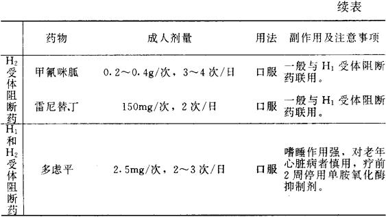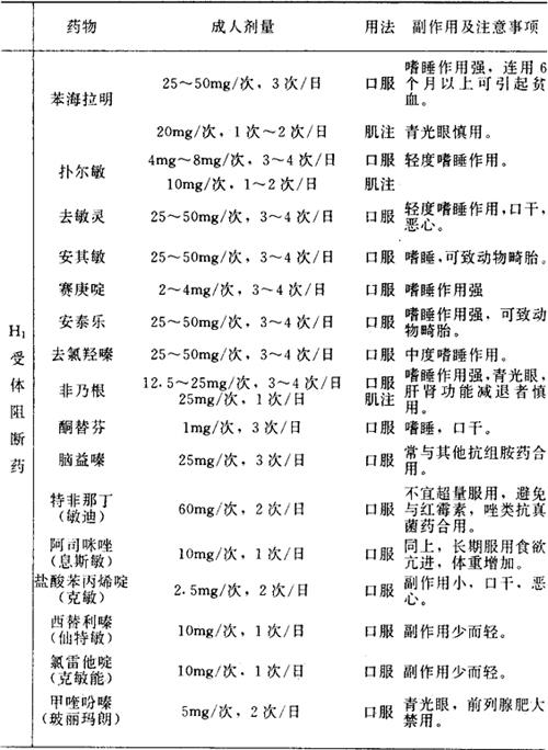 释义 | 抗组胺药物 〔作用〕 组胺是过敏反应中一种重要化学介质,主要储存于肥大细胞、嗜碱性白细胞的颗粒中,当发生过敏反应或受到某些理化因素的刺激,使这些细胞脱颗粒,将组胺释放到组织中,与细胞膜上的组胺受体结合、引起皮肤、粘膜毛细血管扩张、渗透性增加,产生红斑、风团、平滑肌收缩;刺激神经末梢引起瘙痒;胃液分泌增加等而引起临床上一系列症状。抗组胺类药物大多数有与组胺相同的乙胺基团的化学结构,因而能与组胺竞争性争夺效应细胞上组胺受体,起到类似物竞争作用,使组胺不再能与后者结合,阻断了组胺发挥作用,从而发挥控制和消除临床症状的作用。由于作用的受体不同,抗组胺药分为H1受体阻断药和H2受体组断药。 1.H1受体阻断药 与组胺争夺效应细胞上的H1受体,拮抗组胺引起的毛细血管扩张、血管通透性增加和平滑肌收缩等。传统的H1受体阻断药,尚有一些其他方面的作用,如抗乙酰胆碱、抗5-羟色胺的作用;对中枢神经系统有镇静、安眠、止吐及抗震颤麻痹的作用等。新一代H1受体阻断药,如特非那丁(敏迪)、阿司咪唑(息斯敏)、氯雷他啶(克敏能)、西替利嗪(仙特敏)及甲喹吩嗪(玻丽玛朗)等基本上不能通过血脑屏障,因而显着的减少了嗜睡等副作用。氯雷他啶和西替利嗪不仅能高度选择性的阻断外周H1受体,而且有抗变态反应作用,能够抑制肥大细胞脱颗粒;有效地抑制变态反应过程中粘附分子(adhension)的表达;明显的抑制迟发反应及炎症细胞趋化和浸润。对变态反应的早期和晚期均有改善作用。甲喹吩嗪同样地对外周H1受体有高度选择性阻断作用和抑制肥大细胞脱颗粒,并有调节迷走神经紧张性作用,但本品有抗胆碱能作用。 2.H2受体阻断药 能与组胺争夺H2受体,拮抗了组胺引起的胃液分泌增加,血管扩张和血压下降等作用,甲氰咪胍尚有止痒、抗病毒、免疫修复及抗雄激素作用。常与H1受体阻断药联合应用治疗某些变态反应性疾病。 〔适应证〕 1.H1受体阻断药 (1)多种变态反应性疾病,如荨麻疹、血管性水肿、药疹、接触性皮炎及湿疹等。 (2)多种瘙痒性皮肤病,如神经性皮炎、瘙痒症、痒疹等。 2.H2受体阻断药 人工荨麻疹、慢性荨麻疹、血管性水肿、色素性荨麻疹、真性细胞增多症、女性雄激素性多毛症及带状疱疹等。 〔禁忌证〕 1.H1受体阻断药 (1)对H1受体阻断药过敏者。 (2)昏睡状态或服用大量中枢神经抑制剂者。 (3)狭窄性胃溃疡、幽门十二指肠梗阻。 (4)青光眼忌用非那根、苯海拉明和甲喹吩嗪。 (5)有肝、肾、脑(癫痫等)疾患的既往史或合并症者;前列腺肥大者禁用甲喹吩嗪。 2.H2受体阻断药 肝肾功能障碍、孕妇及哺乳期妇女慎用。 〔制剂与用法〕 常用的抗组胺类药见表1。 表1 常用的抗组胺类药物的制剂和用法 〔副作用〕 1.H1受体阻断药 (1)中枢神经抑制作用,如嗜睡、眩晕、头昏、疲乏等。主要是传统的H1受体阻断药这些作用明显,但少数病例则产生中枢兴奋作用,可引起惊厥。 (2)阿托品样作用,如口干、心动过速、视力模糊等。 (3)胃肠道反应,如恶心、腹痛等。 (4)长期服用,有增加食欲,体重增加作用。 (5)特非那丁、阿司咪唑过量服用或合并应用红霉素或唑类抗真菌药物,可致心脏QT间期延长,严重室性心律失常等。 2.H2受体阻断药 头痛、眩晕、恶心、呕吐、腹泻、便秘、肝功能异常、男性乳房发育、药疹及白细胞减少等。 〔注意事项〕 1.H1受体阻断药 (1)高空作业、驾驶员、机器操作人员勿用镇静作用强的药物。 (2)一般不与其他抑制中枢神经药物合用,服药期间不饮酒。 (3)同时使用两种以上抗组胺药可增加疗效,所选用的药物,应属于不同类别,白天宜服用无镇静作用的药物。晚饭后或睡前可应用具有镇静安眠作用的药物。 (4)应用特非那丁和阿司咪唑时,嘱患者一定按推荐剂量服用,避免与红霉素和唑类抗真菌药同期服用。 2.H2受体阻断药 服药期间定期检查血象。 |