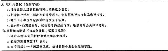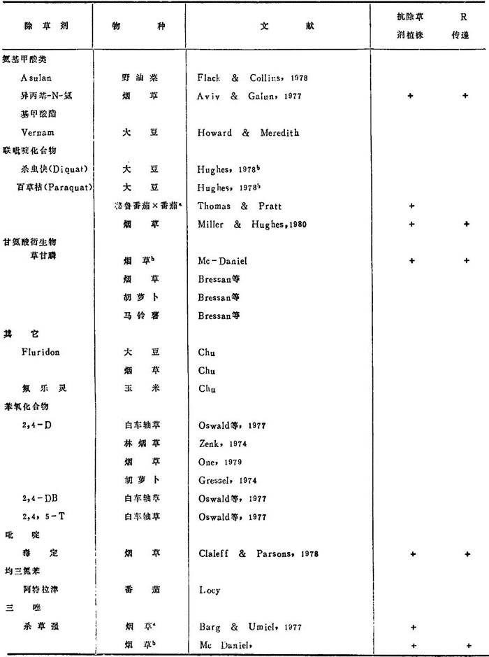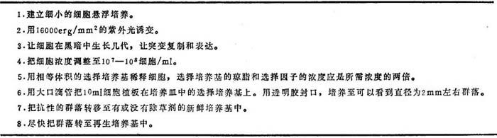 把小苗(高约7.5-10mm)转移至长根培养基。通常用没有生长素和细胞分裂素的培养基。转移之前,用无菌商品生根液浸苗的下端,可能有促进生根之效。生根后,从培养基中小心地取出植株,种在潮湿的盆栽土中。注意不要伤根。从培养中得到的植物角质层极差,没有发育好的维管束系统和气孔。因此,植株“锻炼”前防止脱水是重要的。用塑料罩、玻璃杯或塑料袋把盆子罩起来即可防止失水。植株应保持潮气,但不湿。出现新叶时,在几天内把罩子去掉。在植株充分锻炼后,可移至温室供进一步研究用。 (四)测定植物除草剂抗性 表11一11总结了测试除草剂抗性的技术。从抗除莠剂细胞培养体再生的植株可能抗除莠剂,也可能不抗。有些情况下,除莠剂抗性在发育过程中明显消失。这种不稳定抗性,可能是由于后生遗传,基因组的暂时改变,或在整体植株上表型不能表达。后生遗传在功能上定义为“在正常发育中涉及一种稳定类型的细胞的变化”。后生遗传变化是在选择压力的反应中产生的,除去掉压力后可能会恢复。 表11-11 分析再生植株的除莠剂抗性 另一种可能性是,除莠剂抗性性状可能在基因组中存在,或是不能表现或是表现的水平太低不足以保护植物。一些研究者已证明,从敏感植株再生的愈伤组织可表达抗性性状。可能除莠剂抗性基因是分别活化的,即有的基因只能在愈伤组织状态表达,在分化的植株组织不能表达。也可能是,这种性状可在植物组织中表达,但在体外提供除莠剂抗性的代谢变化还不足以保护植株。例如,百草枯的毒性是百草枯还原和再氧化以后所形成的自由基的作用。百草枯的还原是通过光合作用的电子达到的。细胞培养物光合作用处于低水平,向百草枯的电子流相对较低。因此,脱毒酶水平足以保护细胞培养物的解毒酶的水平,可能不足以保护正在进行光合作用的植株,它的电子流是很高的。 如果从一个抗性和敏感细胞组成的嵌合体再生植株,也可能失去抗性。如果在非选择性的培养基上,敏感细胞具有选择性生长的优势,它们的生长可能超过抗性细胞系,产生敏感的植株。另一方面,可能由于抗性性状的多效性的,突变体表型也可能不是形态发生的。在这种情况下,只有敏感细胞可以形成植株。 测定植株抗性的程序因被测的除莠剂而不同。某些情况下,已有测定植株抗性的相对简单的方法,这种方法对植株没有损害。另一些情况下,必须用整体植株进行测试。下面列出用于测试百草枯、杀草强和甘氨酸衍生物的测试系统;然而,对每一种除莠剂都应独立进行检测。应该指出,植株和细胞培养体对于除莠剂敏感性可能是不同的,而且,对于每一种情况下除莠剂的选择水平应分别测定。 所需设备。为了测定百草枯毒性,需如下物品:(a)50厘米玻璃培养皿,(b)溶解在水中的致死或半致死剂量的除莠剂,即10-6M,10-5M和10-4M,(c)用叶子进行测定(叶子应从健康植株的相同节位取样,因为酶水平随叶子和植株年龄而变化),和(d)11mm打孔器。此外,为了测定杀草强和甘氨酸衍生物抗性,还需要:(a)注射器,(b)杀草强溶于水中浓度为2g/1,同时加入3%吐温(Tween)20,和(c)甘氨酸衍生物。 测定百草枯抗性的程序。用打孔器从对照植株和推测的抗百草枯植株的叶片打取圆片。把叶圆片漂浮在含有各种水平的百草枯培养基上。圆片必须和溶液保持接触。培养皿上加盖,把培养皿放入培养箱,用日光灯24h照光。所有的培养皿应受到同样强度的光照,这一点是重要的。 24h和48h观察叶圆片。其反应将视光照强度而不同。通常对照叶片在24h内变白或成棕色(与叶子中的非叶绿素色素有关)。抗性叶仍然是绿的。部分抗性(忍耐)的植株由部分发白,到全部变白所需时间较长。如果需要,可用95%乙醇提取叶绿素,测定损失的叶绿素。 测定杀草强抗性的程序。选取高约30cm的植株。从植株的近顶部选取长约为5cm的叶子一片。把0.5mg杀草强(0.25ml)施于叶上。敏感植株二周内在分生组织区表现出缺绿。抗性植株不出现缺绿。 测定甘氨酸衍生物抗性的程序。选取植株和叶片如上法所叙。10-6克分子的甘氨酸衍生物(0.1ml Rounclup)施于叶子。甘氨酸衍生物能杀死植物的根。在1-2周内发生萎蔫。通常在一个月内,敏感植物死亡。抗性植物不萎蔫。分生组织区可能会失绿,但抗性植物会克服这种失绿。 (五)遗传分析 为了结论性地证明从细胞培养物得到的除莠剂抗性是否有遗传基础。必须表明这种性状可以有性生殖传给后代。对于百草枯,杀草强和毒草定已经证明可经有性生殖传递;然而只有毒草定证明无疑是孟德尔分离方式。对于毒草定抗性,已证明在3个突变体是由于单个显性基因,在第4个突变体是由于一个半显性基因。Thomos和Pratt曾经观察到番茄自交植株后代以及与敏感植株回交后代中,百草枯抗性和敏感性的分离。没有观察到正常的孟德尔分离。他们相信在番茄的百草枯抗性中涉及显性和半显性的核等位基因。有4株植物通过有性生殖传递百草枯抗性,在愈伤组织和整体植株都表达出百草枯抗性。然而,这种性状只能传给大约2%的后代。此外,自花授粉或杂交的种子有大约50%是无生命力的。无论是高水平无生命的种子和分离频率低,可能是由于在再生前长时间培养所累积的附加突变和染色体畸变的结果。因此,应该尽快从抗性细胞系再生植株。Hughes正在培养抗百草枯的R1植株,以进一步作分离测定