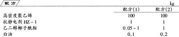 按配比分别将配方(1)、配方(2)中的白油与乙二醇椰子酰胺和抗静电剂HZ-1混合均匀,得到抗静电母料,再分别同树脂共混,制成产品。