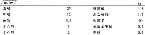 将三乙醇胺溶于水中,加热至80℃成为热水溶液。再将除香精外的其余组分混合,加热至80℃,在不断搅拌下徐徐将其加入热的水溶液中,混合均匀,冷却至40℃时加入香精,搅拌均匀,即为成品。