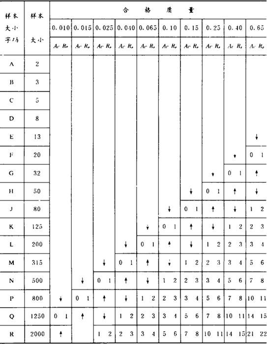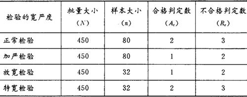 释义 | 抽样方案的求法 要确定抽样方案,必须具备5大要素,这5大要素是: (1)合格质量水平(AQL值); (2)检验水平(IL); (3)批量(N); (4)抽样方案类型,一次、二次或五次; (5)抽样方案宽严度,正常、加严、放宽或特宽。 根据这5大要素,检索抽样方案的步骤如下: 步骤1:检验水平+批量→样本大小字码; 步骤2:抽样方案宽严度+抽样方案类型→选择主抽检表; 步骤3:字码+合格质量水平→(n;Ac,Re)。 例:有一批自行车采用GB2828进行外观检查,批量N=1500,合格质量水平AQL=1.5,检验水平IL=Ⅱ,求一次正常抽检方案。 步骤1:读取样本大小字码。利用标准表2(见表9-3),找到批量N=1500的行〔1201-3200〕与检验水平Ⅱ所在列,这行列相交栏得样本大小字码K。 步骤2:选定抽检方案表。求一次正常抽检,要选定标准表3(见附表2)。 步骤3:读取抽样方案。在选定的表3(见附表2)上,找到样本大小字码K所在的行与AQL=1.5所在的列,这行列相交得到判定数组Ac=5,Re=6,并在同行中得出n=125。故所求的抽样方案为n=125,Ac=5,Re=6。 例:有一批洗衣机,批量N=450台,规定AQL=1.0,IL=Ⅲ,求一次正常、加严、放宽,特宽抽样方案。 步骤1:从标准表2(表9-3)中,找到批量N=450的行〔281-500〕与IL=Ⅲ所在的列相交得字码J。 步骤2:由于求一次正常、加严、放宽与特宽抽样方案,故分别选定抽检标准表3(附表2),表4(附表3),表5(附表4),表6(附表5)。 步骤3:由标准表3(附表2),标准表4(附表3),标准表5(附表4)、标准表6(附表5)可分别得一次正常、加严、放宽、特宽抽样方案如下: 表9-4 一次检验抽样方案 使用放宽与特宽两种方案的判断如下: (1)使用放宽抽样方案的判断为:在本例中,当d≤1时,判该批产品合格;当d≥2时,判该批产品放宽检验不合格。 (2)使用特宽抽样方案的判断为:当放宽检验的d=2时,使用特宽方案进行判断合格;当d≥3时,使用特宽方案进行判断不合格。 用特宽检验方案重判后,不管判合格与否,从下一批开始必须转回正常检验。 |