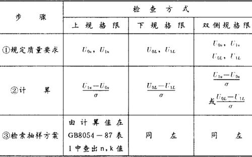 释义 | 抽样方案的确定 使用“σ”法时,按下述表列步骤确定抽样方案: 表9-6 使用“S”法时,确定抽样方案的步骤与使用“σ”法相同,但应把计算栏中的σ换成S,把检索抽样方案栏中的GB8054表1换成表2。 无论使用“σ”法或“S”法,采用双侧规格限时,必须满足两个条件: |