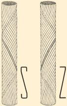 粗纱、细纱、复丝中的纤维以及股线、绳索中的各股纱线的倾斜方向。倾斜方向与字母S中部相同的,称为“S拈”,又称“正手拈”(图一);倾斜方向与字母Z中部相同的,称为“Z拈”,又称“反手拈”(图二)。