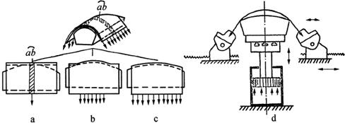 释义 | 拉弯成型方法 拉弯是将板料的两边夹紧,利用凸模上顶对板料施加拉力,使板料产生不均匀拉应力和拉伸应变,随之板料与凸模贴合面逐渐扩展,直至与凸模型面完全贴合的弯曲方法。 拉弯方法主要适宜于弯曲材料塑性好、表面积大、曲度变化缓和光滑、质量要求高的双曲度飞机蒙皮,并在纵拉和横拉设备(表9-6)上采用纵向和横向两种方式将其拉弯成型。 表9-6 拉弯设备的主要技术规格 (一)单层蒙皮拉形 1.双曲度蒙皮的两种拉弯形式 如图9-15所示,双曲度蒙皮有纵向和横向两个曲度(图9-15a中的R1和R2),当蒙皮的纵曲度很小,横曲度相对较大时,适宜于横拉,即沿横曲度方向拉伸板料(图9-15b),并且只有横拉才能更有效地发挥拉伸的作用,使板料易于贴膜。 图9-15 蒙皮的两种拉弯形式 a.纵、横向两个曲度 b.横拉 c.纵拉 对于图9-15c所示的狭长蒙皮,虽然其纵向曲度比横向曲度小得多,但为了减少板料两端的夹紧余量(图9-15b、c中的影线面积),采用纵拉比较有利,如中型和大型飞机机身蒙皮的弯曲制造。 2.蒙皮的横拉工艺过程 如图9-16所示,蒙皮横拉过程可分为三个阶段。 图9-16 蒙皮横拉过程及设备 a.开始阶段 b.中间阶段 c.终了阶段 d.横拉设备原理图 (1)开始阶段(图9-16a):(1)将长方形的毛料弯过凸模夹入两边的夹钳中,然后上升凸模,依靠台面的升降产生拉力,使毛料沿弧线ab与凸模脊背相接触,这时材料只受弯曲变形。 (2)中间阶段(图9-16b):毛料开始产生明显的不均匀拉伸,若将毛料沿横切面方向划分为无数条带,随着凸模上升,ab附近的条带即首先拉长与凸模脊背贴合。凸模继续上升,与之相邻的条带依次受到拉伸,也与模具表面贴合。循此渐进,直到最边缘的条带也与模具贴合为止,于是整个毛料的内表面就得到凸模表面的形状。 (3)终了阶段(图9-16c):毛料与模具表面完全贴合后,再将毛料继续作少量拉伸,使最边缘的材料所受的拉应力超过屈服点,尽量减少回弹,提高工件的成型准确度。 拉弯过程时,可将排成一排且固定不动的小夹钳,根据台面上模具的位置和形状(图9-16d中箭头所示方向)加以调节,使拉力的作用方向和凸模边缘相切。 3.蒙皮的纵拉工艺过程 蒙皮的纵拉过程可分为四个阶段,如图9-17所示。将毛料横向弯曲,装入机床夹钳的曲线钳口内(图9-17a)。然后纵向弯曲毛料,使毛料与凸模脊背成线接触,此时毛料的纵向长两边将因弯曲压应力的作用而失稳起皱,形成波纹,如图9-17b所示。 图9-17 蒙皮纵拉过程及设备 a.横向弯曲 b.纵向弯曲 c.纵向拉伸 d.纵拉设备原理图 随后再拉伸毛料,使与整个凸模表面吻合(图9-17c)。这一阶段与横拉相同,材料沿宽度方向的应力和应变分布极不均匀,中间脊背处的材料纤维延伸最多,而在两侧边缘处应变为零。 最后,少量增加拉力补拉毛料,使边缘的材料变形量超过屈服点。纵拉使用设备原理如图9-17d所示。 (二)多层薄板与组合拉形 生产中常用的拉弯成型方法有单层、多层和组合拉形三种。 (1)单层拉形:是指一张板料适用于一次拉弯成型的零件和纵向拉形的零件,以及多道拉弯工序的最后一道拉形工序。 (2)多层拉形:是指多张板料重叠起来一起拉弯,适用于最终工序之前的各道拉弯工序,必须满足设备技术规格要求。 (3)组合拉形:是指几个零件组合在一个拉形模具上,用一张板料同时成型。适用于材料牌号和厚度一致的零件,要求各零件之间须留出切割工艺余量20~50mm,且工艺余量与各零件型面要保持光滑流线。 |