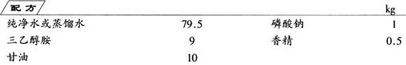 先将香精溶于少量甘油中,再将其余全部组分置于混合器中,搅拌混合均匀,最后加入香精混合液,搅拌均匀,即为成品。