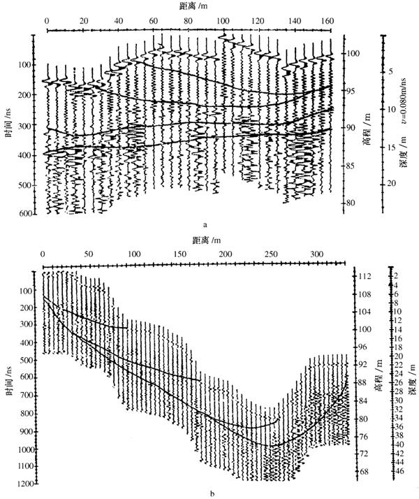 释义 | 探地雷达滑坡体探测 2.5.4.1 滑体结构研究 岩土体的结构特性能综合反映滑坡形成特点,是滑坡研究的重要内容。对残积土体滑坡,土体自上而下由于经受风化程度不同,导致自上而下各亚层的物质组成,结构略有差异。上部地层风化程度高,粘土颗粒细,其中碎石含量少;而下部地层风化程度相对较低,碎石含量增加,粒度变粗。造成土体上部土层相对滞水,而下部地层相对渗水。由于基岩面的坡度与滑坡地形坡度的一致性,造成滑体从上到下含水量的差异。而地层中含水率的变化是影响电磁波传播速度的主要因素,这是因为地层介质的电磁波传播速度ν与介质的相对介电常数εr有如下关系 式中:c为真空中的电磁波传播速度,c=0.3m/ns。介质的相对介电常数εr不仅与介质本身的性质有关,而且与介质中含水率n有如下近似关系 εr=(1-Φ)εmr+n·εwr+(Φ-n)ε0 (2.2) 式中:εmr为介质中骨架的相对介电常数;εwr为水的相对介电常数;ε0为空气相对介电常数,ε0=1;Φ为地层介质的总孔隙度。对于常见残积土εmr=5~15,而εwr=81。由上式可以看出,含水率n的较小变化,可以引起介质的εr值的较大变化。含水率的增加必然使介质的εr值增大,从而使介质的电磁波速度下降。根据波速ν、波长λ、频率f三者的关系: λ=ν/f (2.3) 可知,当发射信号频率一定时,随地层介质波速增加,接收天线所接收到的反射波波长加大;反之,当地层介质的波速降低时,反射波的波长变小。这一特征反映在地质雷达记录的剖面上,波速低的介质层,雷达反射波形的脉宽小,呈细密锯齿状;当地层波速加大时,雷达反射波形的脉宽亦相应加大。 图2-4a为湖北襄樊岘山垭滑体风化残积土的探地雷达图像,图像清楚显示了从上到下残积土中反射波脉冲宽度逐渐加大,地层颗粒度变粗。残积土这种粒度特征导致了从上到下地层透水性增加,从而形成地表土层与基岩弱透水层之间相对透水的地层,造成了地下水沿基岩面向斜坡下的流动,雨季在滑体坡脚常见有水从地层中渗出,增加了土体的不稳定性。 图2-4 岘山垭滑体风代残积土的雷达图像 2.5.4.2 滑动面(带)的研究 在滑动面(带)上由于受强挤压剪切力的作用,滑动面(带)上的岩土结构发生了很大变化,岩土的内在联系受到破坏,常成糜棱状,滑动面上岩土含水率和矿化度都增高了,从而使滑面的介电常数与导电率相对上下地层增高,形成一个强电磁波反射界面,因此在探地雷达图像中可以清晰见到这种特征。不同物质组分的滑体的滑面特征是不同的,下面分别加以论述。 (1)残积土滑体的滑动面特征:残积土滑体的滑床基本由基岩组成。位于基岩面上的风化产物颗粒相对粗,渗水性好,介电常数小。基岩本身由于孔隙率小,介电常数亦小。滑面岩土在滑体重力产生的挤压剪切力作用下成糜棱状,使滑带含水率增高,介电常数增加,于是滑带与上下介质的差异加大构成一个强电磁反射界面。土体本身由于内聚力保持一定完整性,因此滑体内反射波同相轴基本连续。在采用扣除背景值的探地雷达图像中,滑动带呈清晰强反射波。图2-4b为襄樊岘山垭滑坡残积土滑体的滑动面的探地雷达图像,图像中滑面清楚显示了上述特征。 (2)碎石类滑体的滑动带特征:碎石类滑坡处于断裂、褶皱发育地段。滑床由完整的基岩组成,滑带由断裂、褶皱形成的结构面组成。湖北巴东新城滑坡就是这种滑坡的实例,该滑坡是一个古滑体。基岩由二叠系的砂质泥岩与泥灰岩组成。由于受到褶皱构造影响,在基岩面上覆盖有碎裂岩与块裂岩。该滑体地表覆盖有第四系残积土。滑体呈多层结构,滑带基本沿褶皱构造形成的断裂面。在断裂与滑体滑动的双重作用下,滑带岩石结构受到严重破坏,从而形成较宽的强反射面。当断裂跨越地层界面时,滑带两侧反射波同相轴错断。虽然滑带基本沿坡面向下,但在个别地段由于断裂面不规则形成鞍状滑面特征,明显地不同于土体滑坡。图2-5为巴东新城滑坡中的一段剖面的探地雷达图像,图中所示的第一滑体滑动带清楚显示了上述特点。 图2-5 巴东新城滑坡雷达图像 (3)软土中工程滑坡的滑动面特征:软土包括淤泥、粘土及部分粉质粘土,一般为湖相或海相沉积,这些第四系沉积一般都处在低洼处,没经历过构造运动,在自然状态下不会形成滑坡。但随着人类活动,特别是大型工程的基坑开挖,使这类软土出露在陡坎面上,引起了软土中的应力不平衡。这种软土地层抗剪切力极差,极易剪切滑动,从而使上覆地层向应力失衡方向移动,形成滑坡。这种滑动面常常切过上覆地层而延伸到地表。在横切滑体主轴方向的剖面上,可由探地雷达图像中反射波同相轴的错断判别软土滑坡滑动面的位置与形态见图2-6。 图2-6 上海广灵路滑坡雷达图像 2.5.4.3 滑坡体形态研究 滑坡形成于各种各样的地质环境,并表现为各种不同的形式和特征。滑坡研究中滑坡分类的目的在于对滑坡作用的各种环境和现象特征以及产生滑坡的各种因素进行归纳以便正确反映滑坡作用的规律。在实际工作中,常利用科学的滑坡分类去指导勘查工作,衡量和鉴别给定地区产生滑坡的可能性,预测斜坡的稳定性以及制定相应的预防措施。不同类型滑坡往往有其独特的滑坡形态,因此研究滑体的形态对滑体类型判别有重要意义。 对残积土陡坡顺层滑动的滑体,美国R.L.舒斯特建立一个滑体形态模式(图2-7),滑体模型中显着的特点是裂