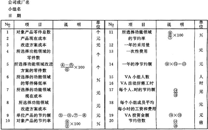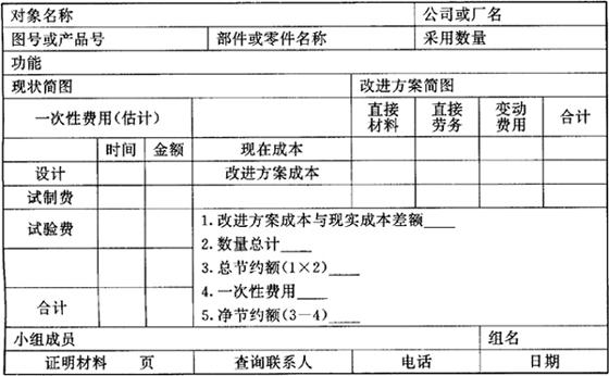 释义 | 提案 详细评价结束后,价值较高的改进方案亦即产生,这时应由价值分析小组把改进方案的实施写成提案,提交对改变产品设计有决策权的部门或领导人。如该方案被接受,价值分析活动即告结束。 提案通常是写成表格的形式,有一项改进意见就填一张如表2.6.11-1的价值分析提案表,最后汇总成表2.6.11-2的提案总表。 表2.6.11-1 提案表 表2.6.11-2 提案总表 |