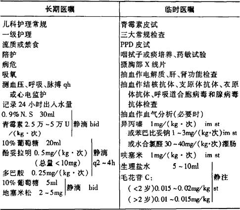 说明:1.中毒症状严重、严重喘憋、脑水肿、中毒性脑病、感染性休克时可使用糖皮质激素,疗程3~5天。 2.洋地黄制剂的使用:毛花苷丙饱和量小于2岁为0.03~0.04mg/kg,大于2岁为0.02~0.03mg/kg,首剂用饱和量的1/2,余量分2次,每4~6小时用一次;应注意不能同时给钙剂。 3.液体量控制在每日30~60mL/kg,1/3~1/4张,输液速度小于5mL/(kg·h),注意电解质和酸碱失衡的纠正。 4.注意并发症的诊断和处理。 |