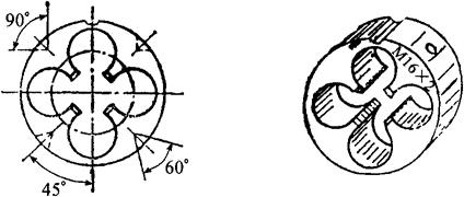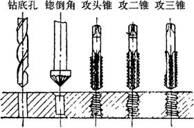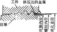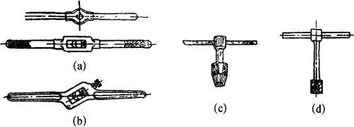 释义 | 攻丝与套丝 1.攻丝 用丝锥(螺丝攻)在孔壁上切削出内螺纹称为攻丝。 (1)攻丝工具 ①丝锥及其结构:丝锥是由合金工具钢或高速钢制成,并经热处理淬硬。丝锥由工作部分和柄部组成(图6-9)。a.切削部分,丝锥的前端呈圆锥形,有锋利的切削刃,起主切削作用。b.校准部分,此部分的螺纹牙形是完整的,用以修光和校准已切出的螺纹,并且是丝锥的备磨部分,其后角α=0°。c.柄部一般为方榫,用来传递扭矩。 图6-9 丝锥 (a)外形;(b)切削部分和校准部分的角度 ②丝锥的种类:丝锥有手用丝锥和机用丝锥两种,每种又分粗牙和细牙两类,以满足加工不同的内螺纹。 ③绞手:攻丝绞手是用来夹持丝锥的工具,绞手有普通绞手和丁字绞手两类,各类绞手又可分为固定式和活动式两种(图6-10)。 图6-10 绞手 (a)固定绞手;(b)活动绞手;(c)活络丁字绞手;(d)固定丁字绞手 (2)攻丝方法 ①攻丝前底孔直径的确定:攻丝时丝锥除起切削作用之外,还对金属材料产生挤压(图6-11),使材料扩张,材料的塑性愈好,扩张量愈大。在钻螺纹底孔时,可通过查表法或用经验公式计算来确定底孔直径。 图6-11 攻丝前底孔直径的确定 对于钢和塑性较大的材料:D=d-t 对于铸铁或脆性材料:D=d-(1.05~1.1)t 式中 D——底孔直径(mm); d——螺纹外径(mm); t——螺距(mm)。 攻盲孔螺纹时,由于丝锥切削部分不能切出完整的螺纹牙形,所以钻孔深度要大于所需的螺孔深度,一般取:钻孔深度=所需螺纹深度+0.7d(d为螺纹外径)。 ②攻丝步骤和方法:攻丝的基本步骤如图6-12。a.选用相应的钻头钻底孔,并对孔口倒角。b.工件的装夹位置必须正确,应使螺孔中心线置于水平或垂直位置使丝锥中心线与底孔中心线重合,然后对丝锥稍加压力并顺时针转动绞手。c.攻丝时,当切削刃切进后就不必再加压力,两手用均衡平稳的旋转力进行攻丝。d.攻锥时,必须以头锥、二锥、三锥顺序攻削。e.攻丝时要经常润滑,以减小切削阻力,减少螺纹表面粗糙度。 图6-12 攻丝的基本步骤 2.套丝 用板牙在圆杆、管子外径上切削出外螺纹称为套丝。 (1)套丝工具 ①圆板牙:圆板牙是加工外螺纹的刀具,它是由碳素工具钢或高速钢制成,并经热处理淬硬。其构造如图6-13,是由切削部分、定径部分和排屑孔组成。圆板牙除了普通套丝用的一种外,还有管螺纹板牙,圆柱管螺纹板牙与普通圆板牙构造相仿,而圆锥管螺纹板牙是单面制成切削锥,只能单面使用。 图6-13 圆板牙 ②板牙绞手架:圆板牙绞手架用以安装板牙,并带动板牙旋转进行套丝的工具(图6-14)。 图6-14 圆板牙绞手 (2)套丝方法 ①套丝前圆杆直径的确定:套丝和攻丝一样,由于材料也要受挤压,切削阻力增大,如圆杆直径选择不当,不仅板牙容易坏,还要影响螺纹的质量。因此,圆杆直径应用下列经验公式来确定。圆杆直径公式为: D=d-0.13p 式中 d——螺纹外径(mm); p——螺距(mm)。 ②套丝要点:a.为了使板牙容易对准工件和切入材料,圆杆端部要倒成15°~20°的锥角。b.将圆杆夹在软钳口内,要夹正紧固。c.套丝时应保持板牙的端面和圆杆轴线垂直,然后适当加压力,按顺时针方向扳动绞手,当切入1~2牙后就不需要加压旋转,同攻丝一样要经常反转,使切屑断碎并及时排屑。d.套丝中要加切削液,以提高螺纹表面质量和延长板牙寿命。 |