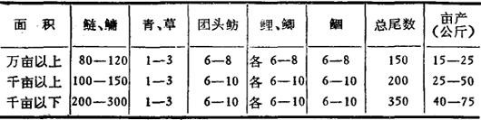 注:表列鲢、鳙放养数系指老口鱼种,如需投放仔口鱼种,则按每尾老口鱼种折合仔口3-4尾计。鲢、鳙比例1∶3。