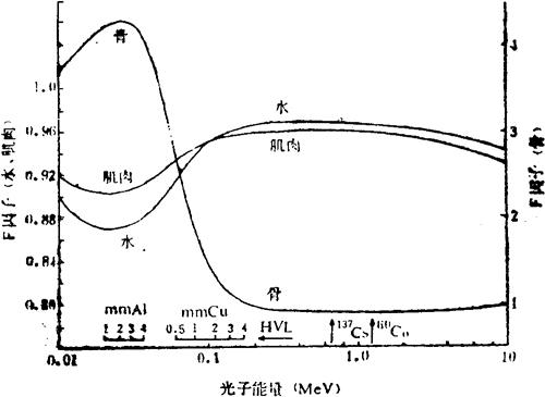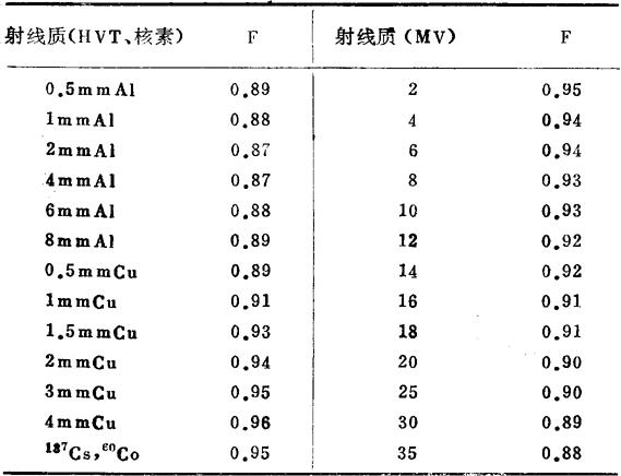 释义 | 放射剂量单位与测量 1.3.1 照射量 照射量(X)指能量小于3MeV的X或γ射线,在质量为dm的小体积空气中释放出来的全部电子(负电子和正电子)完全被空气阻止时,在空气中产生一种符号离子的总电荷dQ的绝对值。单位为伦琴,用下式表示: 1伦琴(R)=2.58×10-4库伦·千克-1 1.3.2 吸收剂量 吸收剂量(D)是电离辐射授予单位质量物质dm的平均能量 吸收剂量的国际单位制为戈瑞(Gy),它与旧单位拉德(rad)的关系为: 1Gy=1焦耳·千克-1=100rad 1rad=10-2焦耳·千克-1=10-2Gy=1厘戈瑞(cGy) 吸收剂量(D)和照射量(X)的关系为: D=X·F (2) 其中,F是伦琴-厘戈瑞转换因子,它与射线质和吸收物质有关。图1-1是骨、肌肉和水中伦琴-厘戈瑞转换因子曲线。 图1-1 骨、肌肉与水中伦琴-厘戈瑞转换因子 1.3.3 吸收剂量的测量 采用空腔电离室剂量仪测量照射量,再转换成吸收剂量。照射量不应作为剂量单位用于放疗,仅作为测量吸收剂量的手段。 小于2MV X射线的测量 (1)电离室用相应半值厚的X射线与标准仪表比对,获得仪表刻度系数N值。 (2)在空气中,电离室置参考点测量照射量,将仪表读数(R)转换成参考点吸收剂量(D0)。单位为cGy,即: D0=R·N·K·F·B (3) 式中,R-参考点仪表读数;K-空气温度、气压修正因子;F-伦琴-厘戈瑞转换因子(表1-2);B-反向散射因子(附表1-2)。 表1-2 水中X、γ射线伦琴-厘戈瑞转换因子F 大于2MV射线的测量 (1)电离室用2MV X射线或钴-60γ射线与标准仪表比对,获得仪表刻度系数N值。 (2)电离室置水模中射野中心轴校准深度测量,将仪表读数转换成吸收剂量(D。)。单位为cGy,即: X、γ射线:D。=R·N·K·F (4) 电子束:D。=R·N·K·CE·P (5) (3)将校准点收吸剂量(D。)换算成参考点吸收剂量(D0),即: 式(4)、(5)、(6)中,R-校准点仪表读数;CE-电子束“伦琴”-厘戈瑞转换因子(表1-3);P-电离室扰动因子 表1-4);Pc-校准点百分深度量。 表1-3 水中电子束“伦琴”-厘戈瑞转换因子cE 表1-4 水中不同能量电子电离室扰动因子P N、K、F同式(3),各种能量射线参考点与校准点深度列于表1-5和表1-6中。 表1-5 X、γ射线水中参考深度 表1-6 水中校准深度 1.3.4 射线质的确定 对千伏级X射线常用半值厚表示穿透能力,半值厚指在空气中使原射线量减弱一半所需要的某种吸收材料的厚度。对大于2MV的X射线多用半峰值水深法确定射线质,即在标准源皮距(SSD=100cm)、射野面积10cm×10cm条件下,测量水模内射野中心轴上50%峰值剂量深度,根据此深度再查出相应X射线MV值(表1-7)。放射性核素直接用平均能量表示射线质。对于高能电子束,入射电子能量(E0)可根据E0=2.5·HVD计算,HVD指电子束在水模中电离能力减弱一半所需水层厚度(cm)。 表1-7 50%峰值剂量深度对应X射线MV值表 |