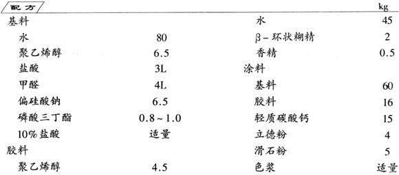 (1)基料的配制 在反应釜中加水80kg,加热至50℃,开始搅拌,然后慢慢加入聚乙烯醇6.5kg,在搅拌下升温至90~95℃。待聚乙烯醇完全溶解后,降温至80℃,在继续搅拌下徐徐加入盐酸3L,再加入甲醛4L进行缩醛化。然后降温至50℃以下,加入偏硅酸钠6.5kg,搅拌均匀,同时加入0.8~1kg磷酸三丁酯至泡沫消失,即得基料。再加入适量10%盐酸,调节基料pH值为8.4~8.8,待用。