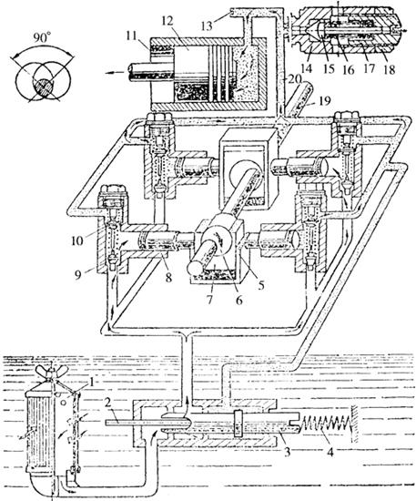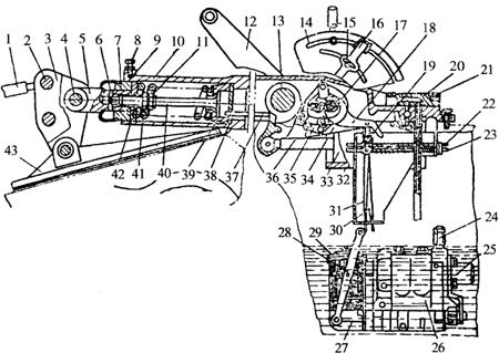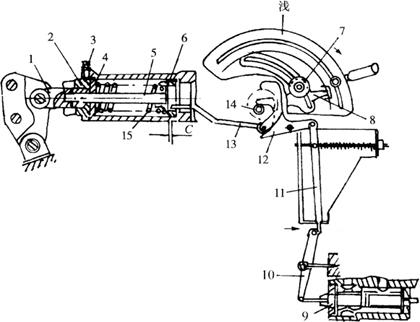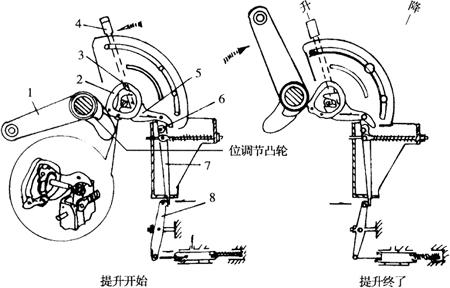 释义 | 整体式液压系的主要部件 整体式液压系的液压油泵、分配器和液压油缸等主要元件组成一个整体式提升器,都装在后桥壳体内。上海-50型拖拉机的整体式液压悬挂系如图4-41所示,由液压系统、操纵机构和悬挂机构3部分组成。滤清器、油泵、控制阀组成的液压机构固定在传动箱壳体内,利用齿轮油作为工作油液。油泵由动力输出轴驱动,设有油泵离合器分离与接合动力。单作用油缸与操纵机构组成提升器总成,装在提升器盖内,油泵与油缸用一根高压油管相连。控制阀由力、位调节机构操纵。单作用液压油缸及悬挂机构的构造见小型拖拉机部分。 图4-41 上海-50型拖拉机整体式液压悬挂系 1.中央拉杆 2.销轴 3.连接板 4.销轴 5.顶杆头 6.弹性圆柱销 7.圆螺母 8.紧定螺钉 9.紧定销钉 10.机盖 11.限位螺母 12.提升臂 13.曲柄 14.扇形板 15.里手柄 16.外手柄 17.位调节滚轮架 18.外拨叉片 19.偏心轮 20.油管压盖 21.液压输出螺塞 22.力调节支承导杆 23.位调节支承导杆 24.安全阀 25.偏心轮 26.液压油泵总成 27.推杆 28.摆动杆 29.滤清器 30.里拨叉杆 31.外拨叉杆 32.液压油缸 33.活塞 34.里拨叉片 35.力调节滚轮架 36.液压油缸顶杆 37.控制顶杆 38.垫板 39.弹簧座 40.顶杆 41.力调节弹簧 42.垫片 43.后桥盖 (一)柱塞式液压油泵 柱塞式液压油泵主要由偏心轴、偏心轴套、柱塞框架、前后盖、泵体、进出油阀和安全阀等组成,其泵油原理与液压油路如图4-42所示。偏心轴转动时,偏心轴套相对于柱塞框架上下滑动,并驱动框架和柱塞左右往复移动,柱塞顶腔容积作周期性变化。容积增大时进油阀开启,出油阀关闭,液压油经滤清器、控制阀、进油阀被吸入柱塞上腔;当容积减小时,油压升高,进油阀关闭,顶开出油阀,向油缸输油。偏心轴转动一周4个柱塞各供油一次。 图4-42 上海-50型拖拉机整体式液压悬挂系 1.滤网总成 2.阀杆 3.控制阀 4.弹簧 5.柱塞框架 6.偏心轮 7.宽偏心轴套 8.柱塞 9.进油阀 10.出油阀 11.液压油缸 12.活塞 13.液压输出螺塞 14.安全阀 15.阀杆 16.弹簧 17.调整螺塞 18.螺母 19.偏心轴 20.高压油管 (二)控制阀 控制阀用来控制进油和回油的流量,它是一个圆柱形滑阀(图4-42),其后端呈圆锥形,有2个超过锥形部分的进油缺口,前端有2个宽而短和2个窄而长的回油缺口,壳体内的3个封油垫圈与控制阀精密配合(间隙为0.01~0.15mm),把阀套分隔成进油和回油两个油腔。进油腔与后盖上的进油道相通,回油腔与前盖上的高压油路相通。控制阀前端方孔内插入阀杆总成的锥形方头,阀杆另一端的平板方头插入回位弹簧套筒,并由挡圈限位。工作中弹簧套筒可带着控制阀来回转动。控制阀后端孔内插入球头推杆,球头推杆另一端与摆动杆相作用(图4-41),操纵机构拨动摆动杆,通过球头推杆可使控制阀作轴向移动,实现农具“中立、提升、快降、慢降”4种工作位置。 (三)操纵机构 操纵机构包括位调节机构和力调节机构两部分。位调节机构由扇形板上的里手柄操纵,控制农具的升降位置和入土速度。力调节机构由扇形板的外手柄操纵,用以调节耕深和操纵液压输出。里、外手柄配合使用,互不干扰。 1.位调节操作机构 位调节操纵机构由里手柄、手柄轴与偏心轮、位调节滚轮架、位调节凸轮、外拨叉片、外拨叉杆和偏心轮、调节杆(支撑导杆)、缓冲弹簧等组成,如图4-43所示。 图4-43 位调节操纵机构 1.外提升臂 2.滚轮架 3.摆动板轴 4.位调节手柄 5.外拨叉片 6.偏心轮 7.外拨叉杆 8.摆动杆 (1)农具升降位置的控制:用位调节机构升降农具时,应先将外手柄扳至“深-浅”区段内“深”的位置,使其不影响位调节的工作。 ①提升:将里手柄往“升”的方向扳时,手柄轴的偏心轮向下推压外拨叉片,外拨片沿滚轮架上的滚轮往前下方滑移,带动外拨叉杆绕支点顺时针转动;通过摆动杆使控制阀克服弹簧力而前移到进油位置,油泵来油使农具提升(图4-43)。 农具提升时,位调节凸轮随着提升轴转动,凸轮升程逐渐减小,在回位弹簧作用下滚轮架及外拨叉片向后摆动,控制阀移到停止进油的中立位置,农具停止提升并保持在某一高度上(图4-43)。里手柄向“升”的方向移动越多,控制阀前移到进油位置的时间越长,农具升得越高。 ②下降:将里手柄向“降”的方向推动时,手柄轴的偏心轮旋转使外拨叉片后端向上抬起,叉口下方与滚轮之间出现间隙。与此同时,回位弹簧向后推动控制阀,通过摆动杆、外拨叉杆使外拨叉片后移而消除此间隙。当控制阀回油缺口与排油道相通时,农具重力作用使油缸中的油液经回油缺口回到传动箱壳体内。农具下降。 农具下降过程中,位调节凸轮随提升轴逆时针旋转,凸轮升程增加,驱使滚轮架向前摆动,外拨叉片前移,经外拨叉杆、摆动杆使控制阀逐渐前移到中立位置,农具停止下降。里手柄往“降”的方向推移量越大,外拨叉片后端与位调节凸轮之间的间隙越大,油缸排油时间越长,农具位置越低。此时,外拨叉片尾端与外拨叉杆上偏心轮之间的间隙也越小,当农具降到最低位置时,该间隙基本消除。 (2)农具下降速度的控制:里手柄在扇形板的“快-慢”区段内移动时可以控制农具的下降速度。 ①快速下降:里手柄推到“快降”位置时,手柄轴的偏心轮转动,将外拨叉片后端上抬,使滚轮与位调节凸轮之间出现间隙。与此同时,外拨叉杆随之绕支点逆时针转动,回位弹簧将控制阀向后推到极限位置,快、慢回油