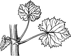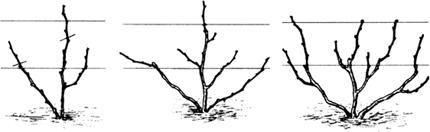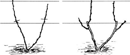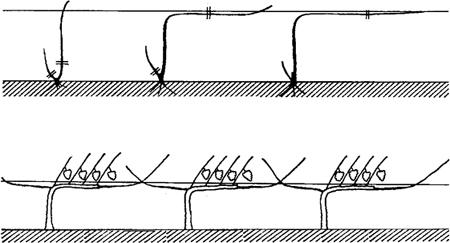释义 | 整形 葡萄整形的目的在于培育出健壮而丰产的植株,使之适应棚室的小气候条件,便于修剪、病虫害防治和采收等操作,从而达到高产、稳产和优质的目的。 目前保护地栽培葡萄常用的树形有下列几种: (1)龙干形整枝 在葡萄温室栽培中常用的有两种类型:第一种称为龙干形整枝,每株为一条龙干,长3~5米,多采用短梢修剪;第二种是双龙干形整枝,即植株从地面上分出两条主蔓,主蔓上着生结果枝组,也采用短梢修剪。这两种龙干整枝适用倾斜式小棚架、棚篱架。具体做法如下: ①独龙干整形。定植后,在春季选留一个健壮新梢培养成主蔓即龙干。该新梢长,不进行摘心,对于新梢上长出的副梢全部“留单叶绝后”。“留单叶绝后”摘心法是对副梢保留一片叶进行摘心,同时除去叶腋的冬芽和夏芽(图21)。冬天将主蔓上的副梢全部剪除,主蔓粗为1厘米处剪截。一般情况下来年主蔓上萌发出的新梢有相当一部分会带有果穗。 图21 “留单芽绝后”的副梢处理方法 第二年萌芽前先将主蔓的前端放低于主蔓的后端,待到后端芽眼萌发生长一段时间后,再将主蔓前端部分提高捆绑到架面上。这样有利于整个主蔓的芽眼萌发和新梢生长,方便以后的结果母枝的选择和培养。对于生长近地面70.0~80.0厘米以下的芽眼萌发的新梢全部抹去,从80厘米开始,带有果穗的新梢留下结果,没带果穗的新梢在主蔓两侧分别每隔30.0厘米留一个健壮新梢培养成结果母枝。对于长度不够的主蔓其顶芽萌发的新梢不结果,作为延长枝按照第一年的方法继续培养,其上面萌发的副梢两侧分别每隔30.0厘米留一个健壮副梢培养成结果母枝,其余的副梢全部进行“单芽绝后”处理。冬剪时除延长头在粗为1.0厘米处剪截外,龙干上的新梢都从基部剪留两个饱满芽作为结果母枝。至此,树形基本形成。 ②双龙干整形。双龙干整形与独龙干整形的方法基本相同。不同之处是独龙干留一个新梢进行培养,双龙干留两个新梢进行培养。 (2)单干水平整枝 主要用于篱架植株整形。视篱架高度和株距的不同,可整成单臂单层水平形和双臂单层水平形。单干水平整枝适合用于T形架和十字形架。 ①单干单臂树形的整形过程。对于生长势较弱的品种,定植当年,选留一强健新梢,只管引缚其直立生长,不进行摘心,对于新梢上萌发的副梢全部进行“留单叶绝后”处理,冬季在新梢粗0.7~1厘米处剪截,所有副梢全部剪除。 第二年萌芽前将前端放低后端抬高。待到后端芽眼萌发生长一段时间后,再将前端部分提高捆绑到铁丝上。对于第一道铁丝以下的芽眼萌发的新梢全部抹去,臂上萌发出的新梢带有果穗留下结果,没带果穗的新梢每隔15~20厘米留一个健壮新梢培养成结果母枝。对于臂长度不够的植株其顶芽萌发的新梢不结果,水平引缚到铁丝上,当生长到与临近植株交接后进行摘心,其上的副梢不进行摘心,只管引缚生长。冬剪时全部新梢都从基部剪留两个饱满芽作为结果母枝,至此,树形基本形成。 对于生长势强的品种,当新梢生长高度超过干高后,将其直接引缚到铁丝上,进行水平生长。当生长到与临近植株交接后进行摘心,其上的副梢,主干上的副梢全部“留单叶绝后”处理。臂上面的副梢,不进行摘心,只管引缚生长,其上面再萌发的副梢全部“留单叶绝后”处理。如果臂上的副梢粗到冬季全部达到0.8厘米以上,则留2~3个饱满芽进行短截,粗达不到0.8厘米则全部从基部剪除。新梢则在粗为1.0厘米处剪截。通常当年即可成形,并有一定的产量。 ②单干双臂树形的整形过程。定植当年,选留一强健新梢,引缚其直立生长。当新梢生长高度达到干高后,进行摘心。对于新梢上萌发的副梢,除先端的两个副梢外,全部进行“留单叶绝后”处理。先端的两个副梢培养成两个臂。当两个臂生长到与临近植株的臂交接后,进行摘心,其上的副梢不进行摘心,只管引缚生长,其上再萌发的副梢全部“留单叶绝后”处理。如果臂上的副梢到冬季生长粗达0.8厘米以上,则留2~3个饱满芽进行短截,粗达不到0.8厘米,则全部从基部剪除。臂在粗为1.0厘米处剪截。在加强管理的条件下,生长旺盛的品种,一般情况下当年即可成形,并有一定的产量。 第二年萌芽前对臂上副梢全部剪除的植株,将前端放低后端抬高。待到后端芽眼萌发生长一段时间后,再将前端部分提高捆绑到铁丝上。对第一道铁丝以下的芽眼萌发的新梢全部抹去,臂上萌发出的新梢带有果穗留下结果,没带果穗的新梢每隔15.0~20.0厘米留一个健壮新梢培养成结果母枝。对臂长度不够的植株其顶芽萌发的新梢不结果,水平引缚到铁丝上,当生长到与临近植株交接后进行摘心,其上的副梢不进行摘心,只管引缚生长。冬剪时全部新梢都从基部剪留两芽作为结果母枝。至此,树形形成。 根据经验,定植当年5月至6月上旬生长高度达到干高,进行第一次摘心植株,当年可形成单干双臂树形,来年并有一定产量。定植当年超过6月上旬生长高度达不到干高的植株,则不适宜培养单干双臂树形,可先培养成单干单臂树形,来年再培养成单干双臂树形(图22)。对于建好温室,再定植树的温室可在早春进行扣棚加温,使葡萄苗早萌芽,早生长,有利树形培养。 图22 葡萄高、宽、垂树形的整形过程(先形成单臂,再形成双臂) 对于篱架栽培的温室,建议采用单干单臂树形。它具有整形更新容易、修剪方法简单、结果早的优点。 (3)篱