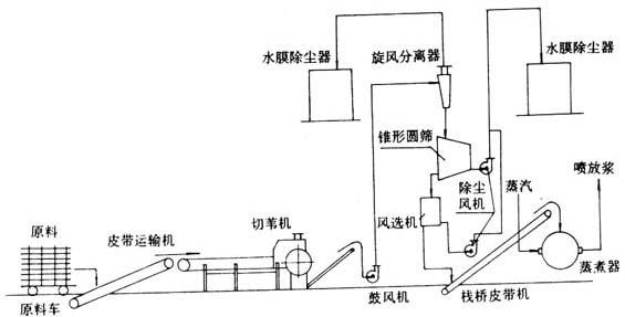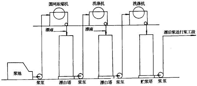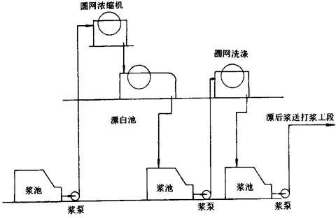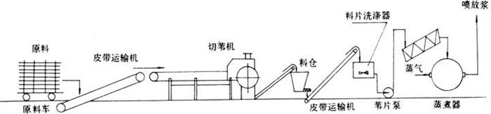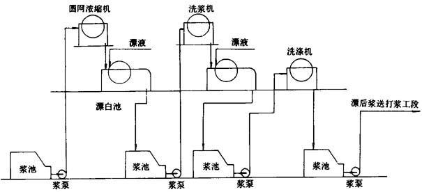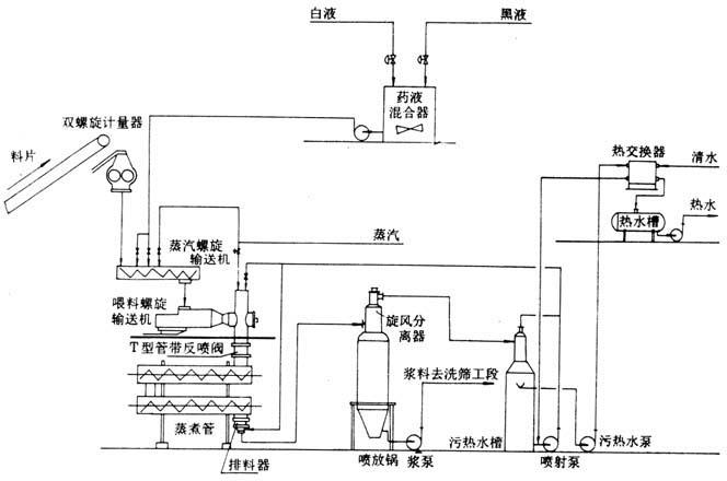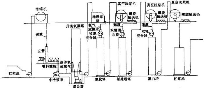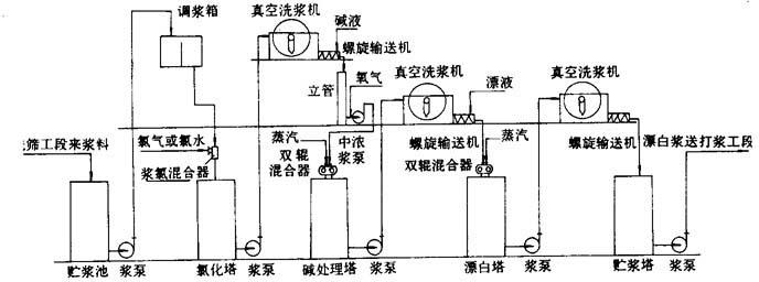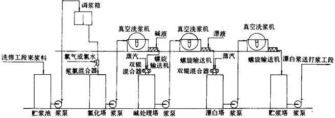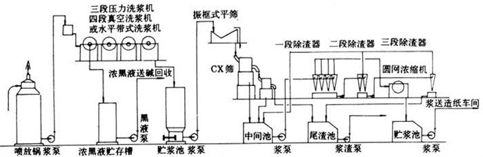 释义 | 文化用纸制浆流程 1.备料生产流程 (1)简易备料流程 图5-4-1 简易备料流程 (2)常规干法备料流程 (3)湿法备料流程 图5-4-2 常规干法备料流程 图5-4-3 湿法备料流程 (4)干湿法结合备料流程 图5-4-4 干湿法结合的备料流程 2.蒸煮生产流程 (1)简易蒸煮流程 图5-4-5 简易蒸煮流程 (2)蒸球常规蒸煮流程 图5-4-6 蒸球常规蒸煮流程 (3)立锅常规蒸煮流程 图5-4-7 立锅常规蒸煮流程 (4)横管式连续蒸煮流程 有单管单喷放、双管单喷放和双管双喷放等形式。 ①单管单喷放连蒸煮流程 图5-4-8 单管单喷放连蒸煮流程 ②双管单喷放连蒸煮流程 图5-4-9 双管单喷放连蒸煮流程 ③双管双喷放连续蒸煮流程。双管双喷放连蒸流程,与双管单喷放流程基本相似,不同的只是第一根蒸煮管对第二根蒸煮管有高出0.15~0.2MPa的压差,产生两次机械喷放作用,达到料片均匀分散成浆的目的。第二根蒸煮第二次喷放可不采用冷喷放的方式。 3.洗涤、筛选生产流程 (1)简易疏解洗涤流程 图5-4-10 简易疏解洗涤流程 (2)常规连续洗筛流程 图5-4-11 常规连续洗筛流程 4.漂白生产流程 (1)单段间歇漂白流程 图5-4-12 单段间歇漂白流程 (2)两段(H1-H2)间歇漂白流程 图5-4-13 两段(H1-H2)间歇漂白流程 (3)两段(H1-H2)连续漂白流程 图5-4-14 两段(H1-H2)连续漂白流程 (4)三段漂白(C-E-H)流程 图5-4-15 三段(C-E-H)漂白流程 (5)加氧处理的三段漂白流程(C-E/O-H) 图5-4-16 三段加氧处理(C-E/O-H)漂白流程 (6)氧碱四段漂白流程(O/E-C-E-H) 图5-4-17 氧碱四段漂白流程(O/E-C-E-H) (7)四段漂白流程 在常规的三段漂后,再加一段次氯酸盐漂白,即C-E-H1-H2最终白度可达85%以上。 (8)过氧化氢补充漂白流程 在常规的三段漂后加一段过氧化氢漂白流程,最终白度可达85%以上,纤维受损伤小,且返黄值低。 |
