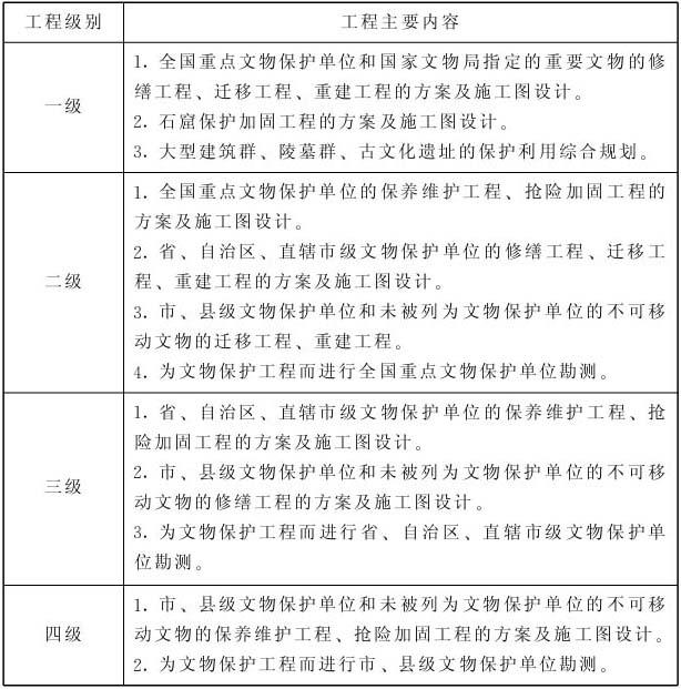 释义 | 文物保护工程勘察设计资质管理办法(试行) 一 总 则 第一条 为加强文物保护工程勘察设计资质管理,根据《文物保护工程管理办法》,结合文物保护工程的具体情况,制定本办法。 第二条 从事核定为文物保护单位和其它具有文物价值的古文化遗址、古墓葬、古建筑、石窟寺和石刻、近现代重要史迹及代表性建筑、壁画等文物保护工程勘察设计的单位资质管理,适用本办法。 第三条 文物保护工程勘察设计是指为文物保护工程而进行的调查、研究、测绘、制定保护方案、工程设计及技术经济分析,编制保护规划,并提供勘察成果资料、设计文件或规划文本的活动。 第四条 凡从事文物保护工程勘察设计的单位,必须按照本办法申请并取得《文物保护工程勘察设计资质证书》,方可承担相应等级和业务范围的文物保护工程。 第五条 国家文物局负责审定、颁发《文物保护工程勘察设计资质证书》和资质年检工作。省、自治区、直辖市文物行政部门负责资质初审和日常管理工作。 资质申报、审定工作每三年一次;年检每年一次。 二 资质等级与标准 第六条 文物保护工程勘察设计资质分为综合资质和专项资质。专项资质适用于保护规划以及壁画、石质文物等有特殊专业技术要求的保护工程。 综合资质等级分为甲、乙、丙三级和暂定级。专项资质不分级。 第七条 甲级资质标准: 一、经主管机关核准登记的企、事业单位,从事文物保护勘察设计业务十年以上,独立承担过不少于十项、工程等级为一级,或者不少于十五项、工程等级为二级及以上的文物保护工程项目的勘察设计,其工程已经竣工,质量合格。 二、法定代表人与技术人员均有较强的文物保护意识,单位总体水平在国内同行业领先,有较高的社会信誉,参加过或有能力参加文物保护工程的规范、规程、标准、定额的编制工作。 三、单位中专职固定且取得国家文物保护工程勘察设计职业资格证书的技术人员总数不少于20人,其中有相关专业高级技术职称的技术骨干不少于8人(应聘并固定在该单位的离退休技术人员不超过20%)。 四、有健全的技术、管理制度和全面质量管理体系。 五、具有与其资质相适应的专业技术装备。 六、注册资金不少于100万元。 第八条 乙级资质标准: 一、经主管机关核准登记的企、事业单位,从事文物保护勘察设计业务五年以上,独立承担过不少于五项、工程等级为二级,或者不少于十项、工程等级为三级及以上的文物保护工程项目的勘察设计,且工程已经竣工,质量合格。 二、法定代表人与技术人员均有较强的文物保护意识,单位总体水平在所在省、自治区、直辖市同行业领先,有较高的社会信誉。 三、单位中专职固定且取得国家文物保护工程勘察设计职业资格证书的技术人员总数不少于15人,其中有相关专业高级技术职称的技术骨干不少于6人(应聘并固定在该单位的离退休技术人员不超过20%)。 四、有较健全的技术、管理制度和全面质量管理体系。 五、具有与其资质相适应的专业技术装备。 六、注册资金不少于70万元。 第九条 丙级资质标准: 一、经主管机关核准登记的企、事业单位,独立承担过不少于五项、工程等级为三级,或者不少于十项、工程等级为四级及以上的文物保护工程项目的勘察设计,其工程已经竣工,质量合格。 二、法定代表人及主要技术人员有正确的文物保护意识,所完成项目得到国家和省、自治区、直辖市文物行政管理部门认可。 三、单位中专职固定且取得国家文物保护工程勘察设计职业资格证书的技术人员总数不少于10人,其中有相关专业高级技术职称的技术骨干不少于3人(应聘并固定在该单位的离退休工程技术人员不超过20%)。 四、有较健全的技术、经营、质量、档案、财务管理制度。 五、具有与其资质相适应的专业技术装备。 六、注册资金不少于50万元。 第十条 暂定级资质标准: 资质条件不低于丙级。 第十一条 取得保护规划以及壁画、石质文物保护等有特殊专业技术要求的勘察设计资质,除应具备上述相应的资质条件以外,还应具有掌握相关特殊技术的专业人员和必要装备。 第十二条 申请国家文物保护工程勘察设计职业资格证书的人员,必须具有相关专业中级以上技术职称,从事文物保护工程勘察设计三年以上,并经培训、考核合格。 三 资质申请和审批 第十三条 申请《文物保护工程勘察设计资质证书》的单位,须向所在地省、自治区、直辖市文物行政部门提出申请。省、自治区、直辖市文物行政部门初审、汇总后,报国家文物局审批。 第十四条 申请《文物保护工程勘察设计资质证书》,应提供下列资料: 一、文物保护工程勘察设计资质申请表; 二、主管机关颁发的企、事业单位证书或文件; 三、法定代表人和技术人员简历、职业资格证书、职称证书、学历证书、身份证复印件; 四、技术骨干的职称证书、职业资格证书、学历证书、身份证复印件; 五、完成的具有代表性文物保护工程的勘察设计合同及验收评估资料; 六、审批机关认为必须的其他相关证件、资料。 第十五条 文物保护工程勘察设计单位取得正式资质并从事勘察设计满三年后,可提出升级申请。 申请资质升级,除提供本办法第十四条所列资料外,还应提供下列资料: 一、原资质证书正、副本; 二、原资质等级历年财务决算年报表。 第十六条 
